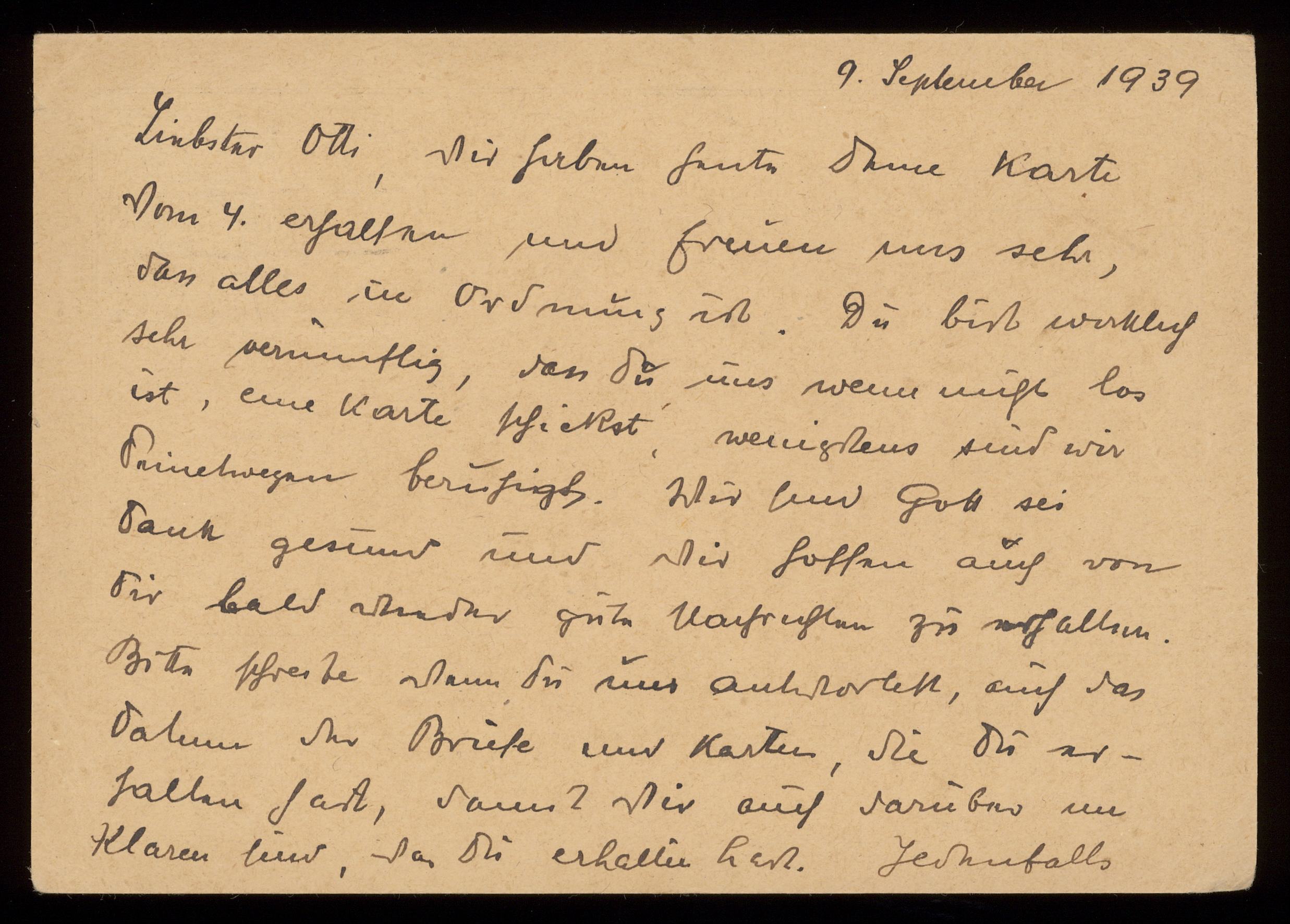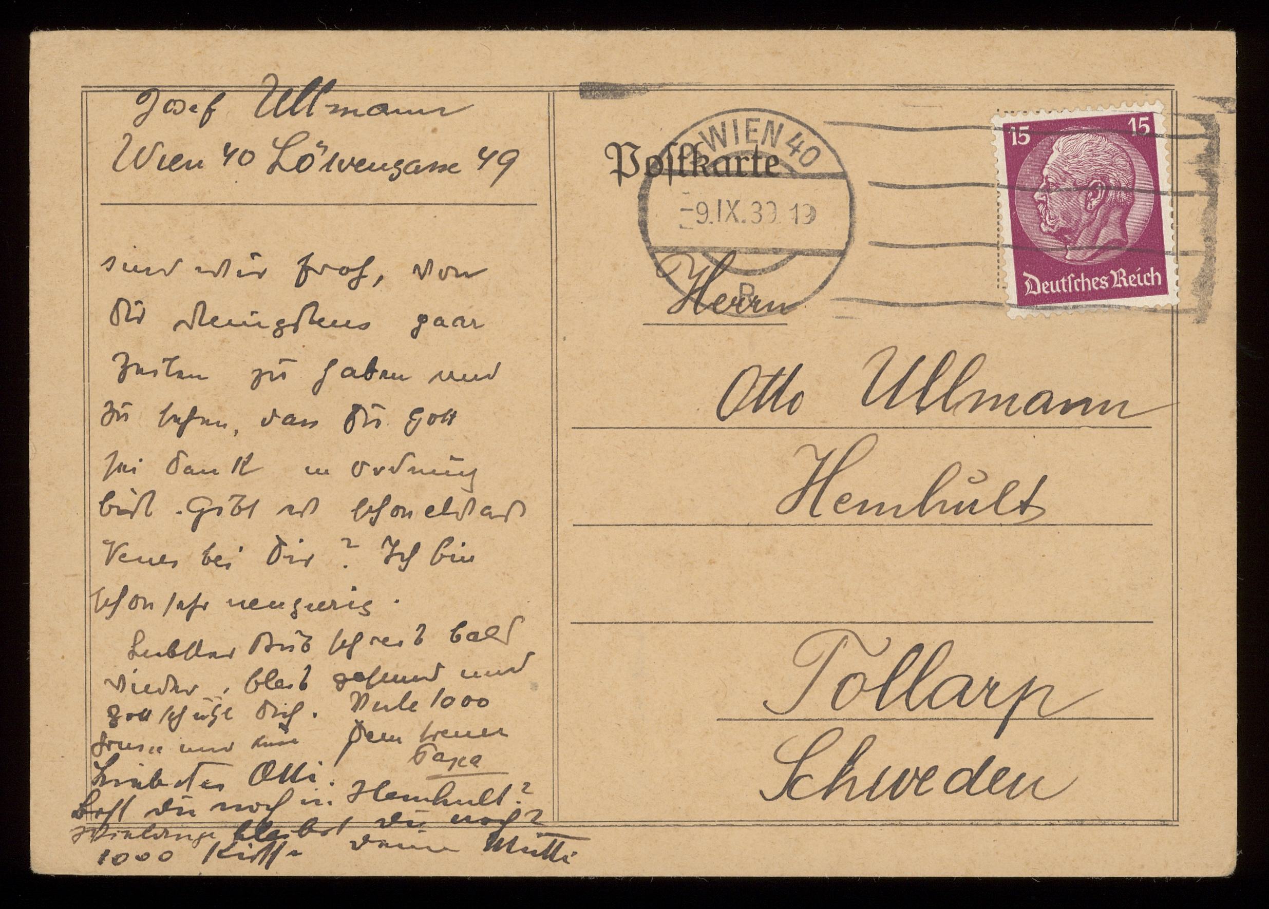 Brev till Otto Ullman från föräldrarna Josef och Elise Ullmann daterat 9 september 1939 Wien.