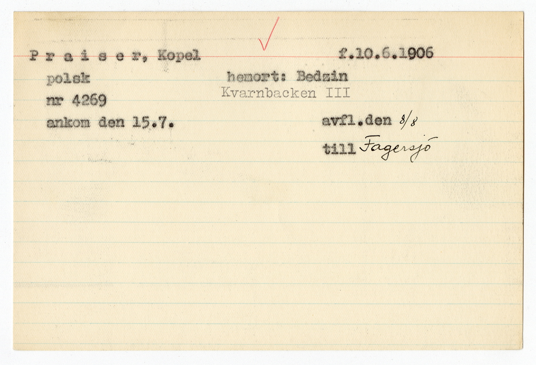Ett skrivkort med patientuppgifter gällande Kopel Praiser.