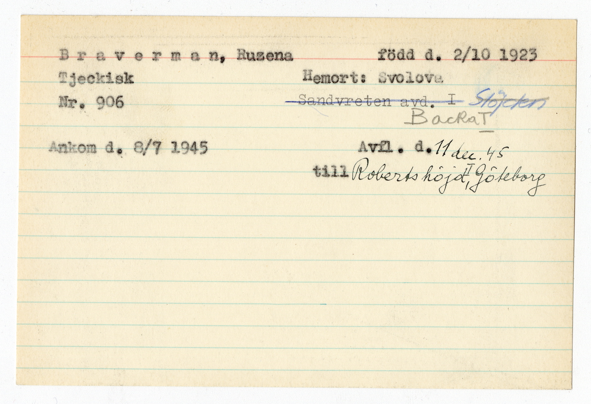 Registerkort Ruzena Braverman