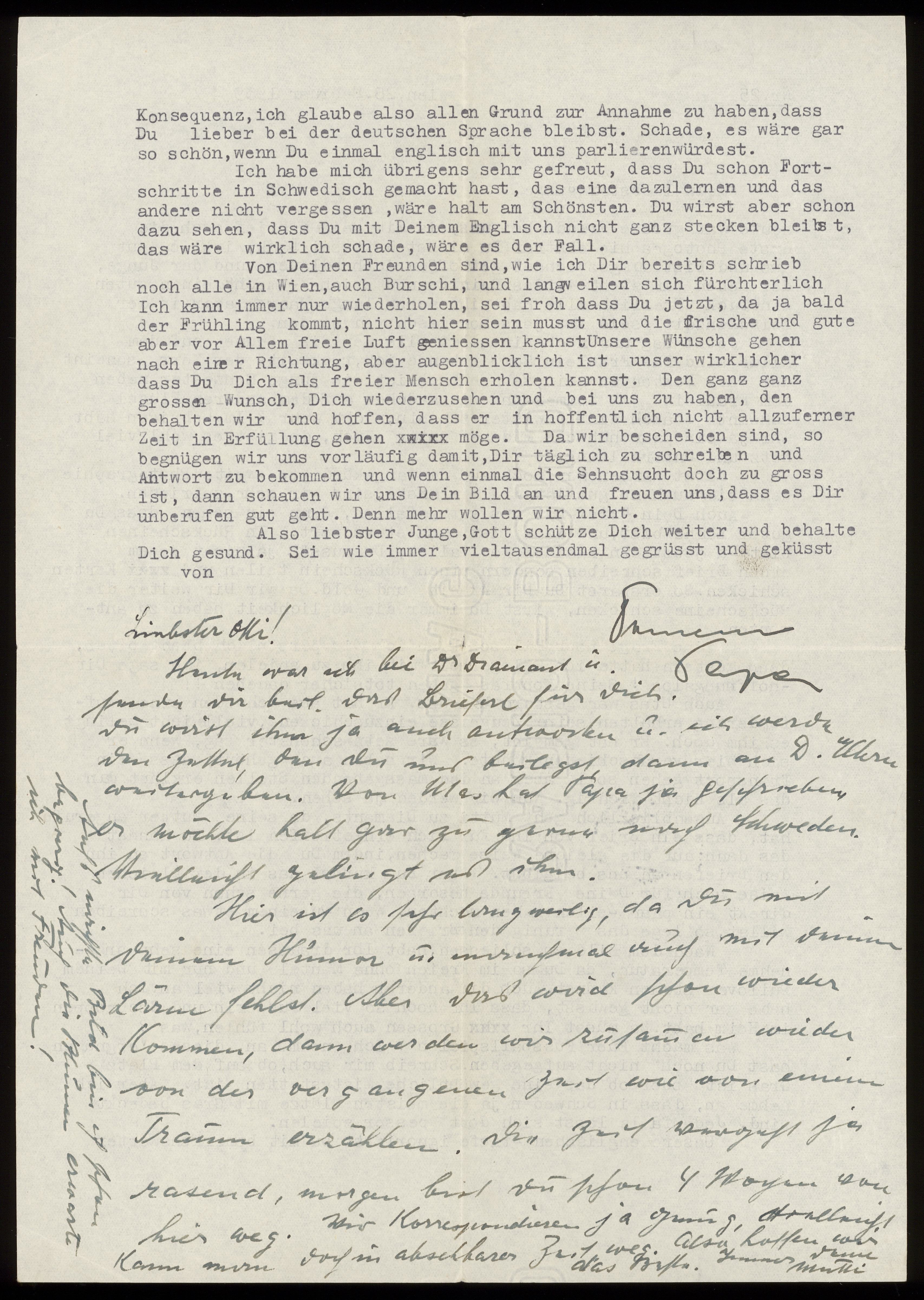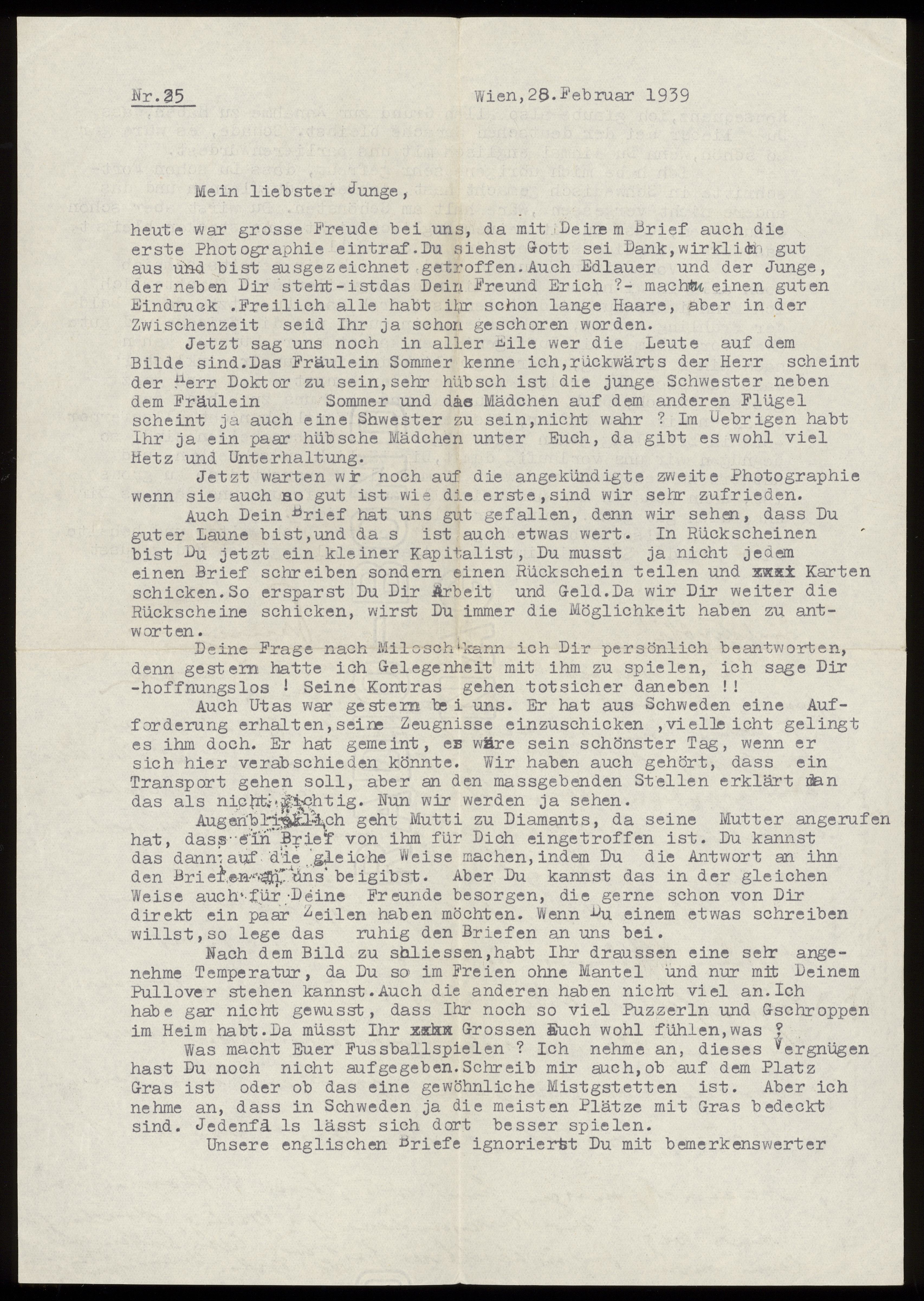 Maskinskrivet brev till Otto Ullman från föräldrarna Josef och Elise Ullmann daterat 28 februari 1939 Wien.