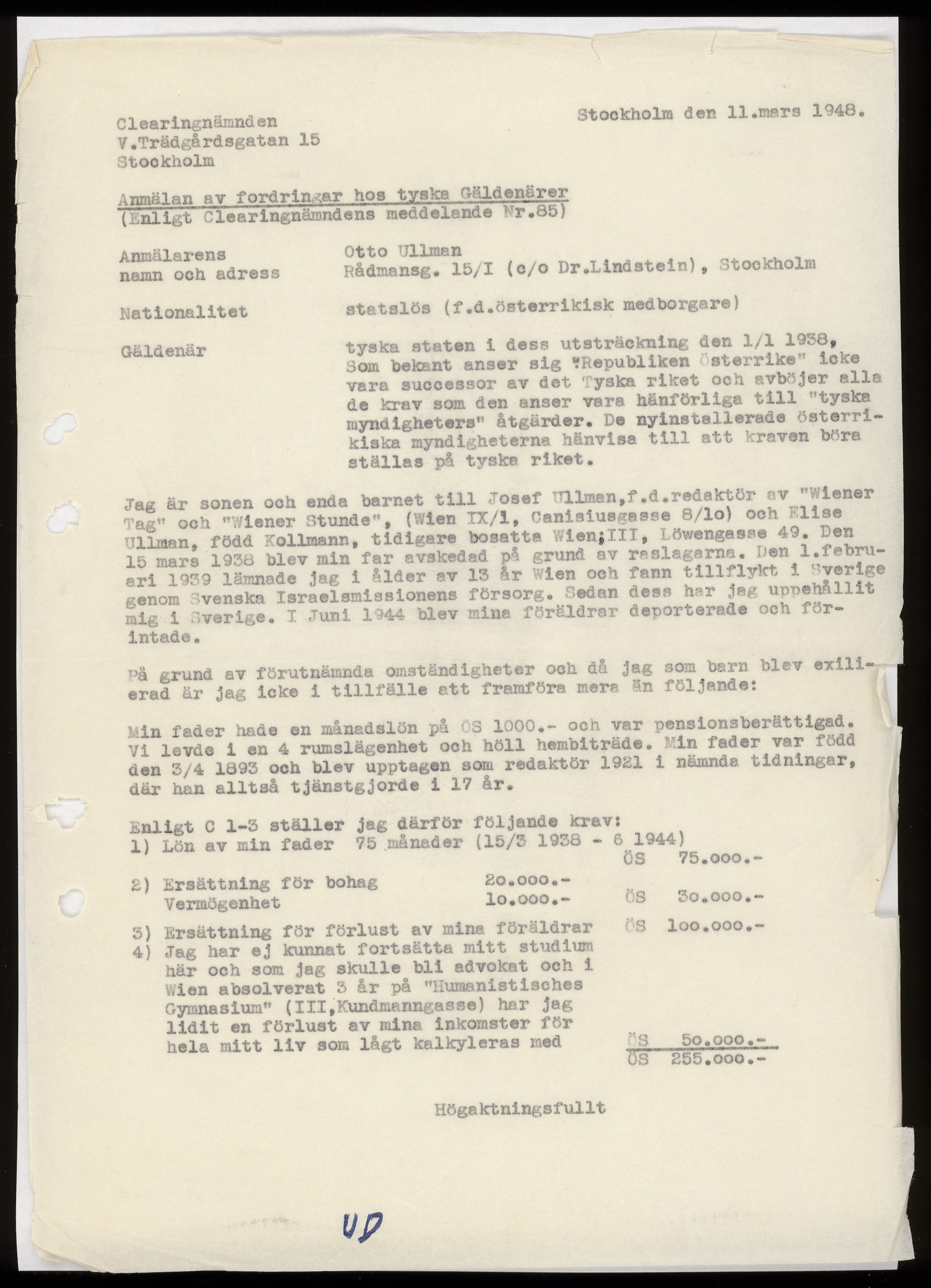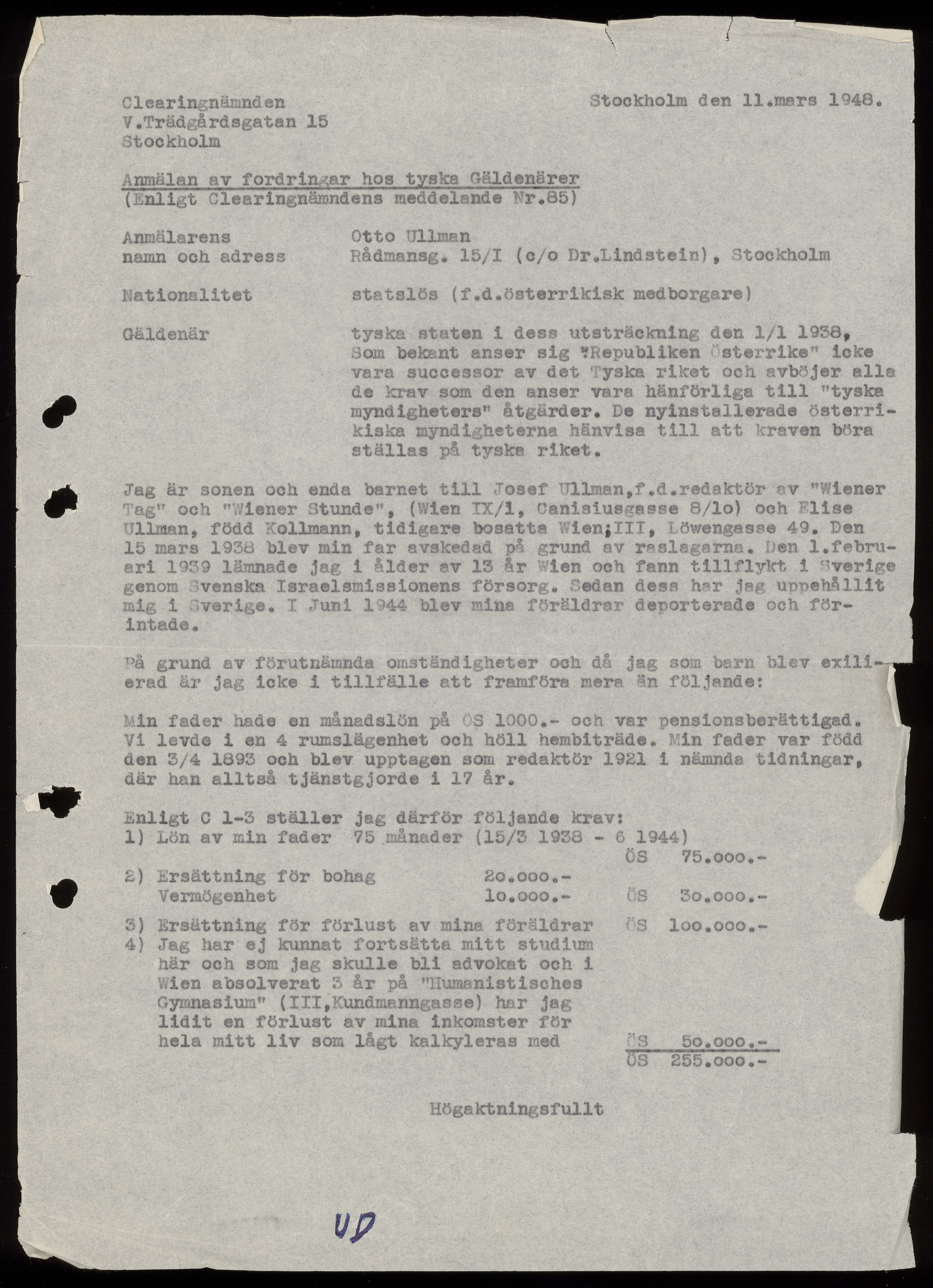 Brev från Otto Ullman 11 mars 1948 Stockholm.