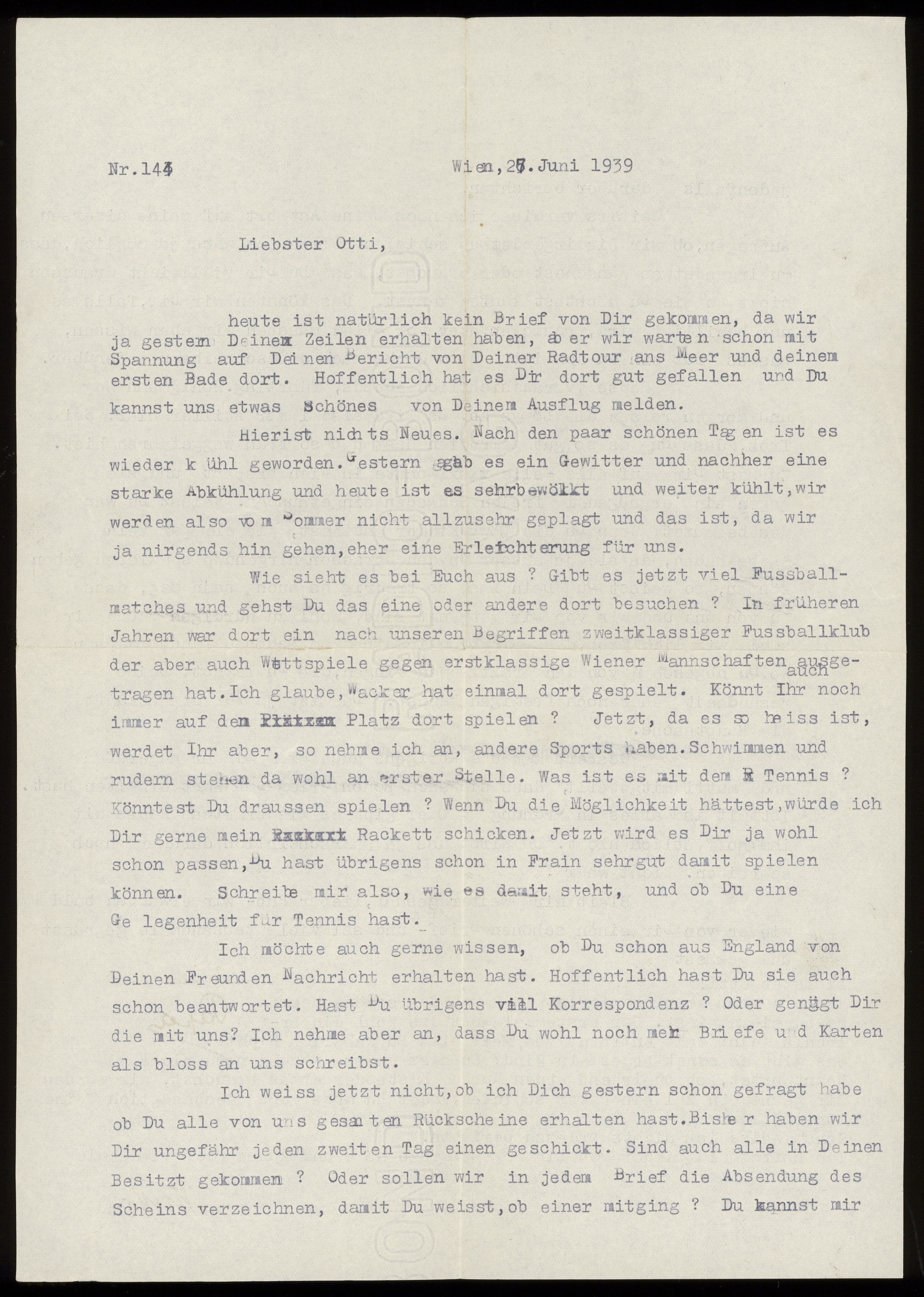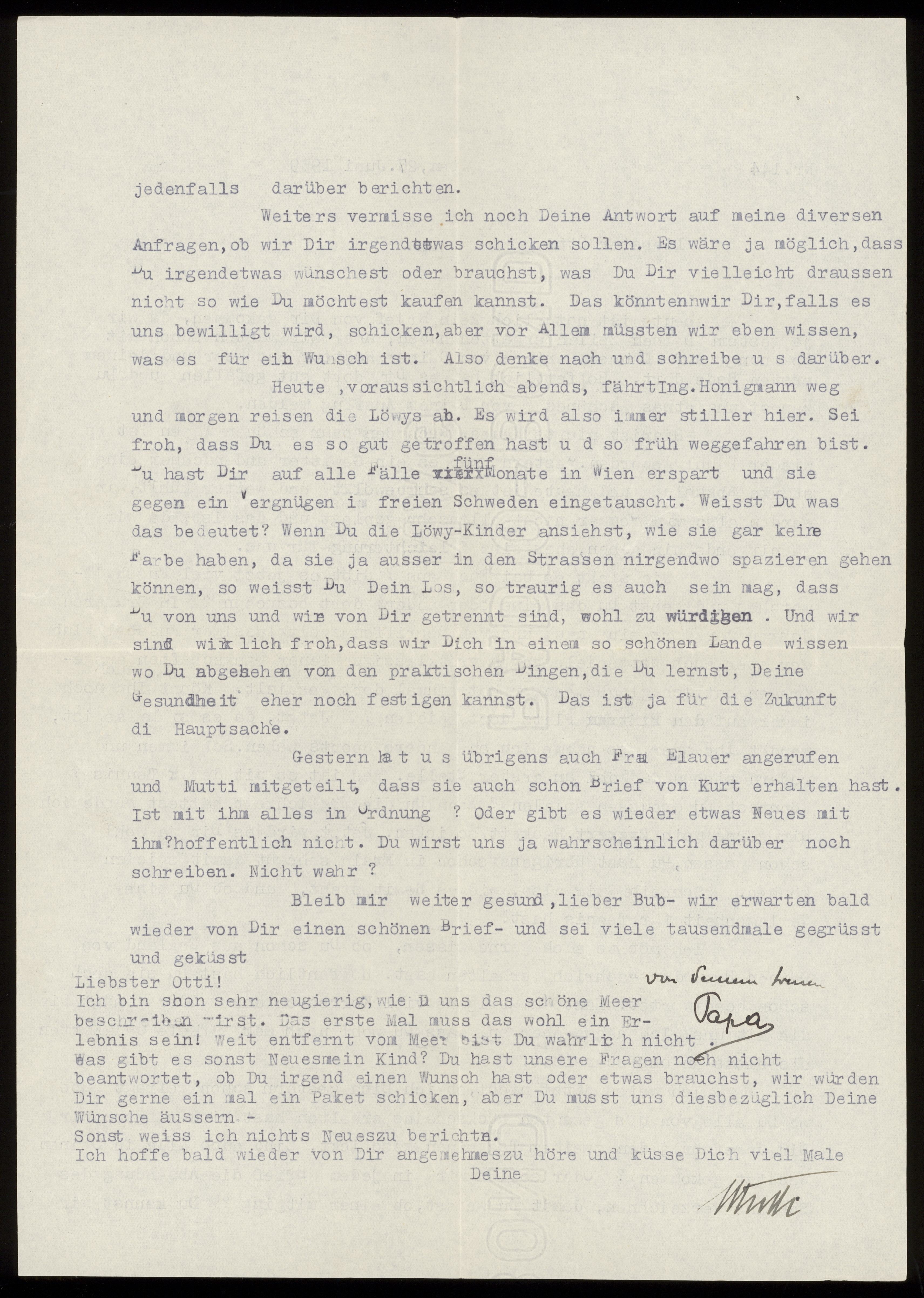 Maskinskrivet brev till Otto Ullman från föräldrarna Josef och Elise Ullmann daterat 27 juni 1939 Wien.
