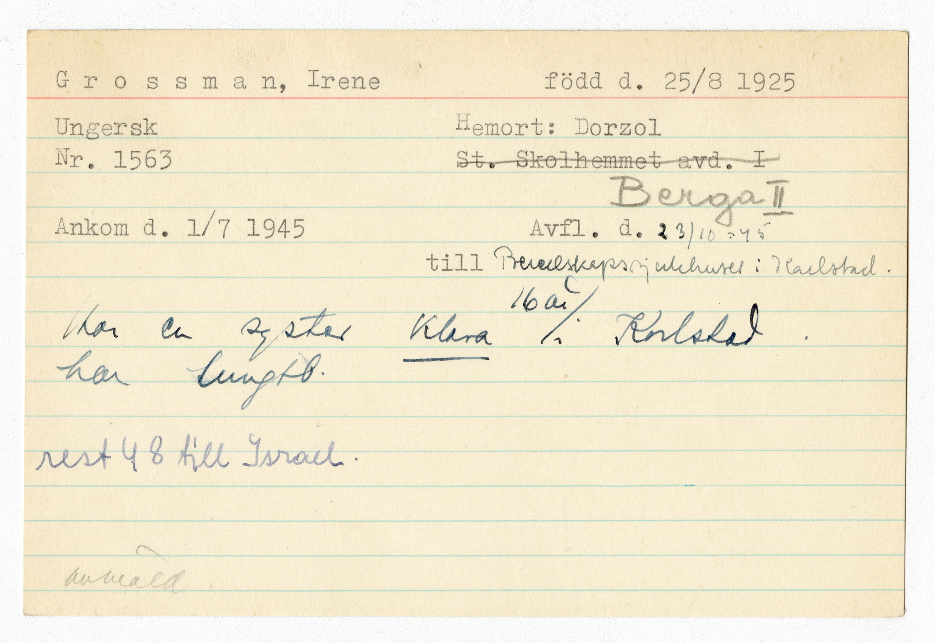 Ett skrivkort med patientuppgifter gällande Irene Grossman.