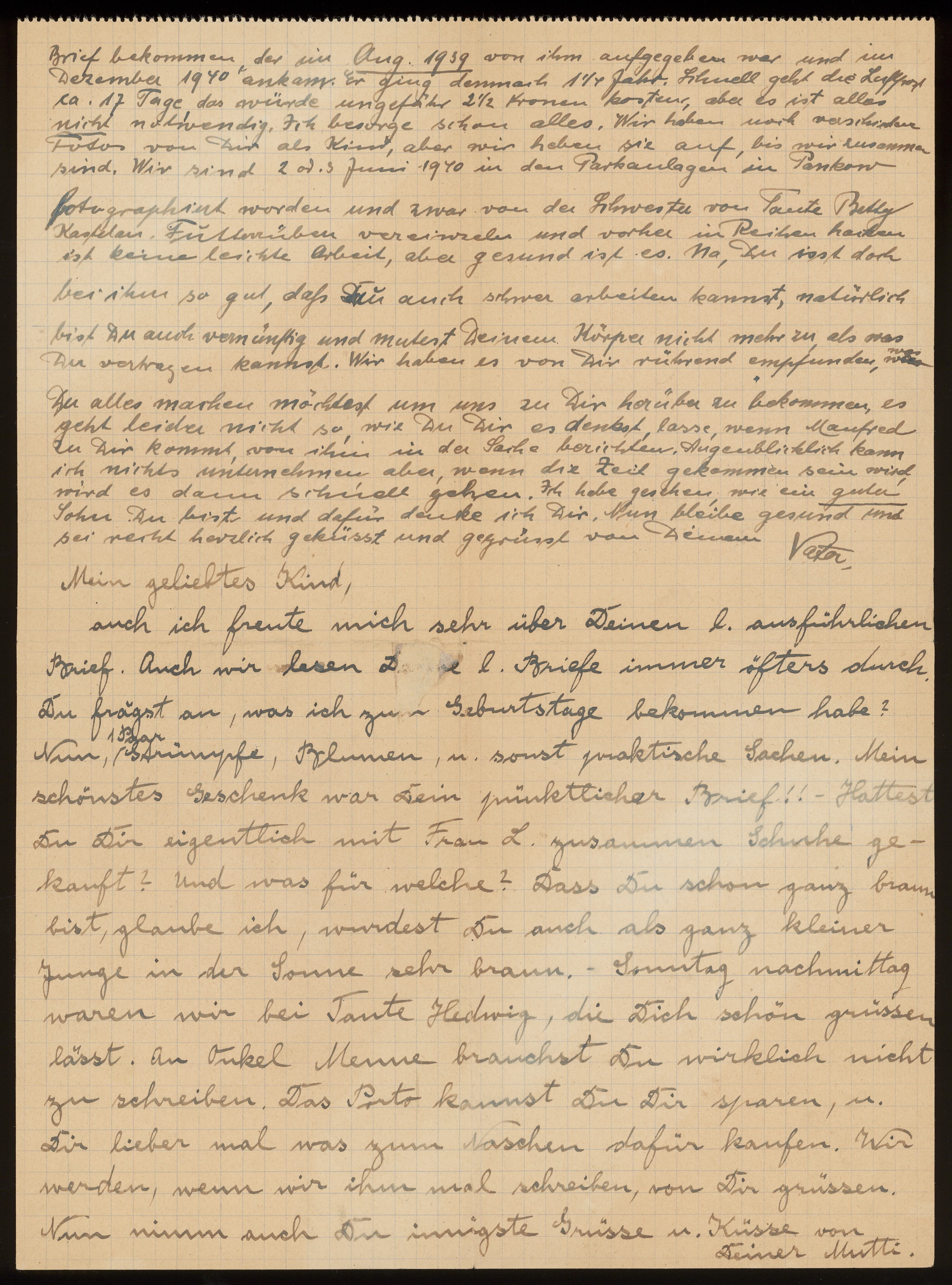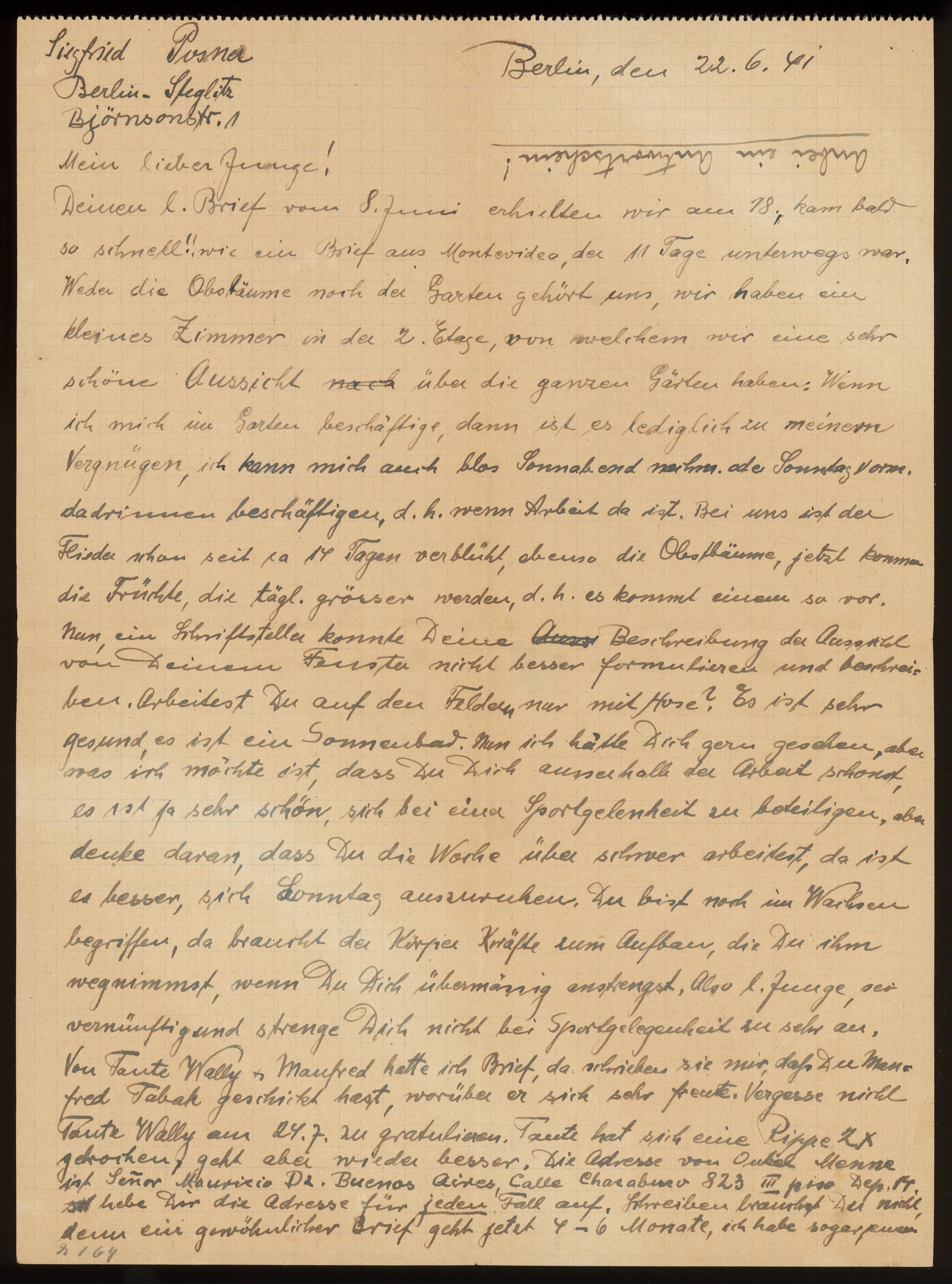 Brev från föräldrarna Anna och Siegfried Posner till sonen Ludwig Posner daterat 22 juni 1941.