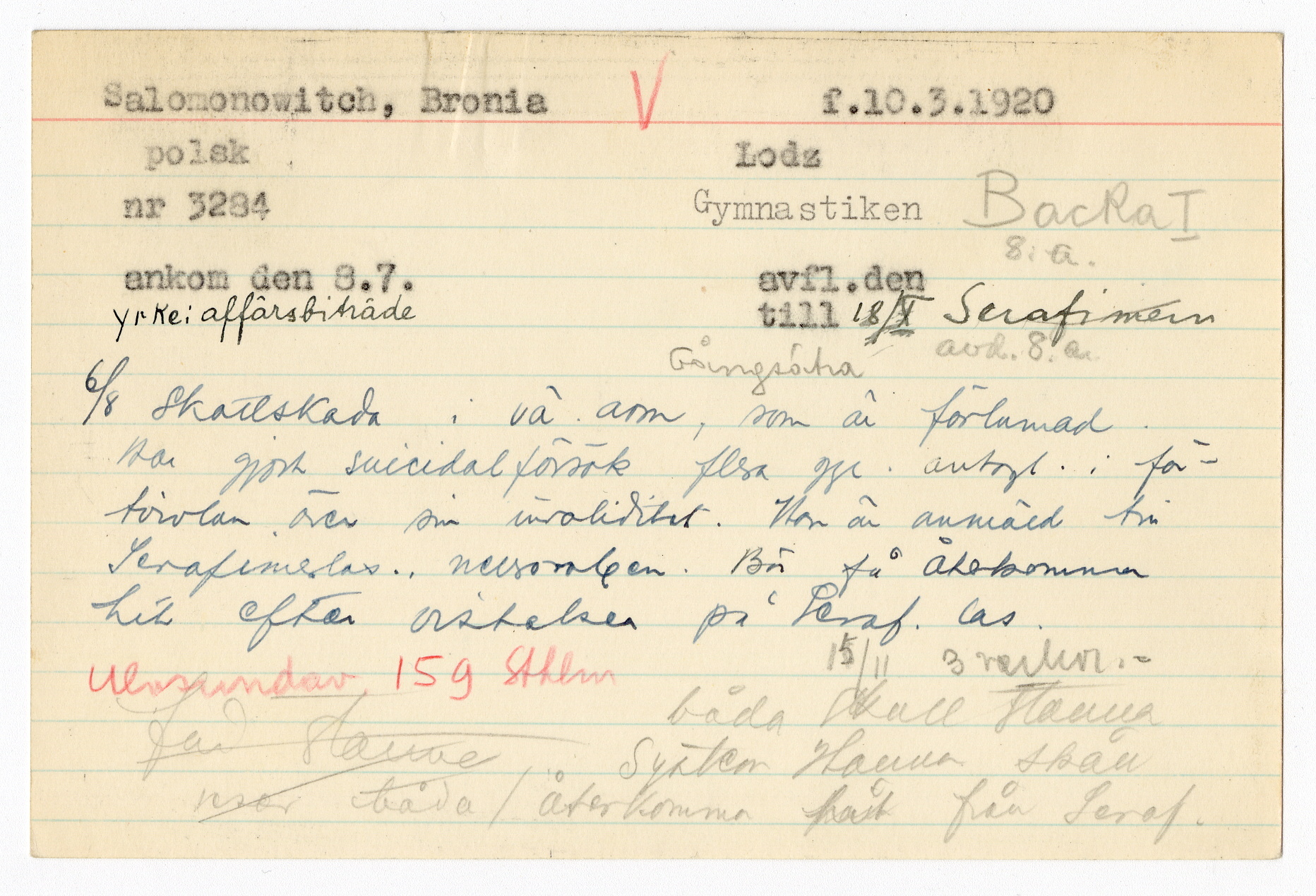 Ett skrivkort med patientuppgifter gällande Bronia Salomonowitch.