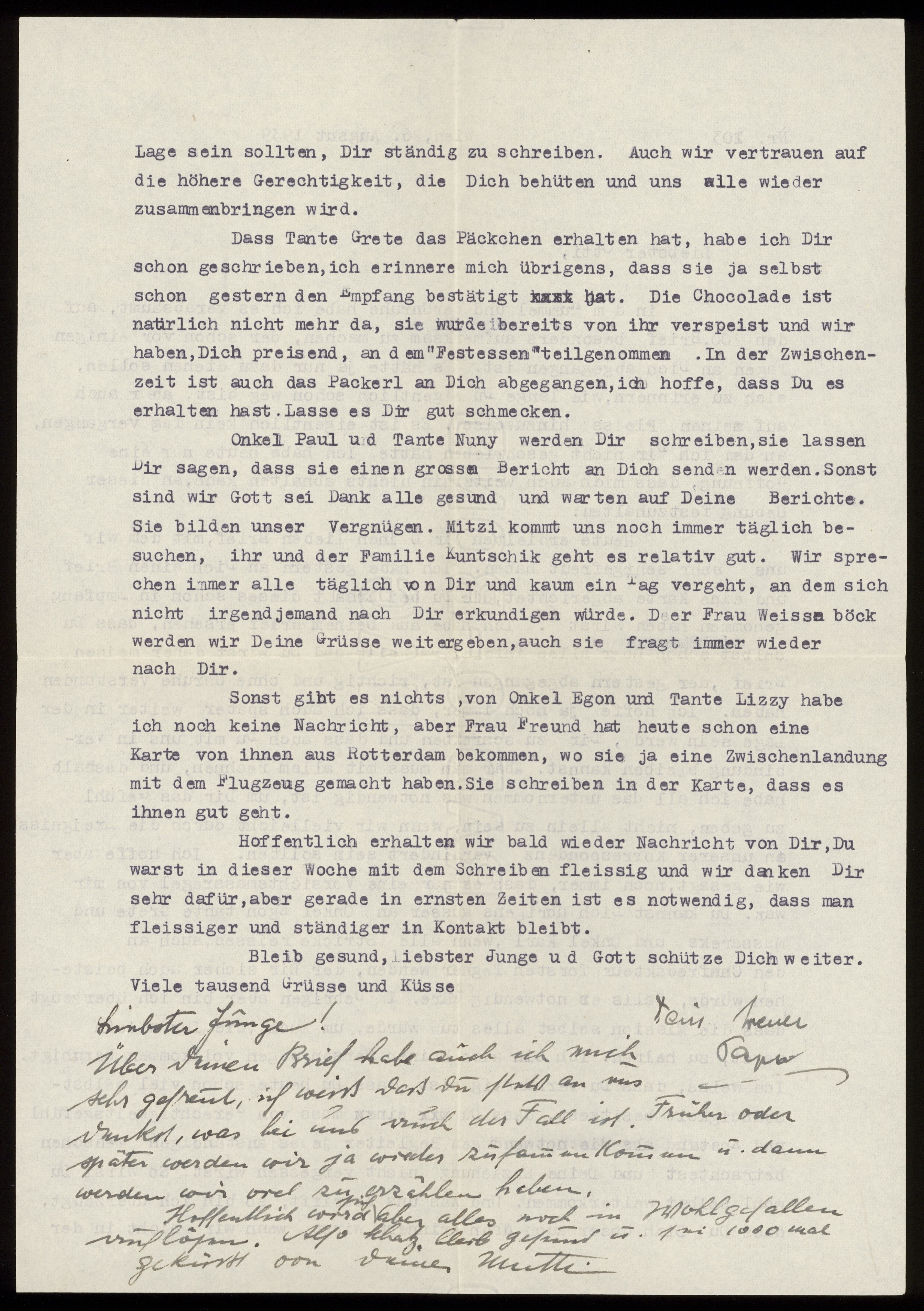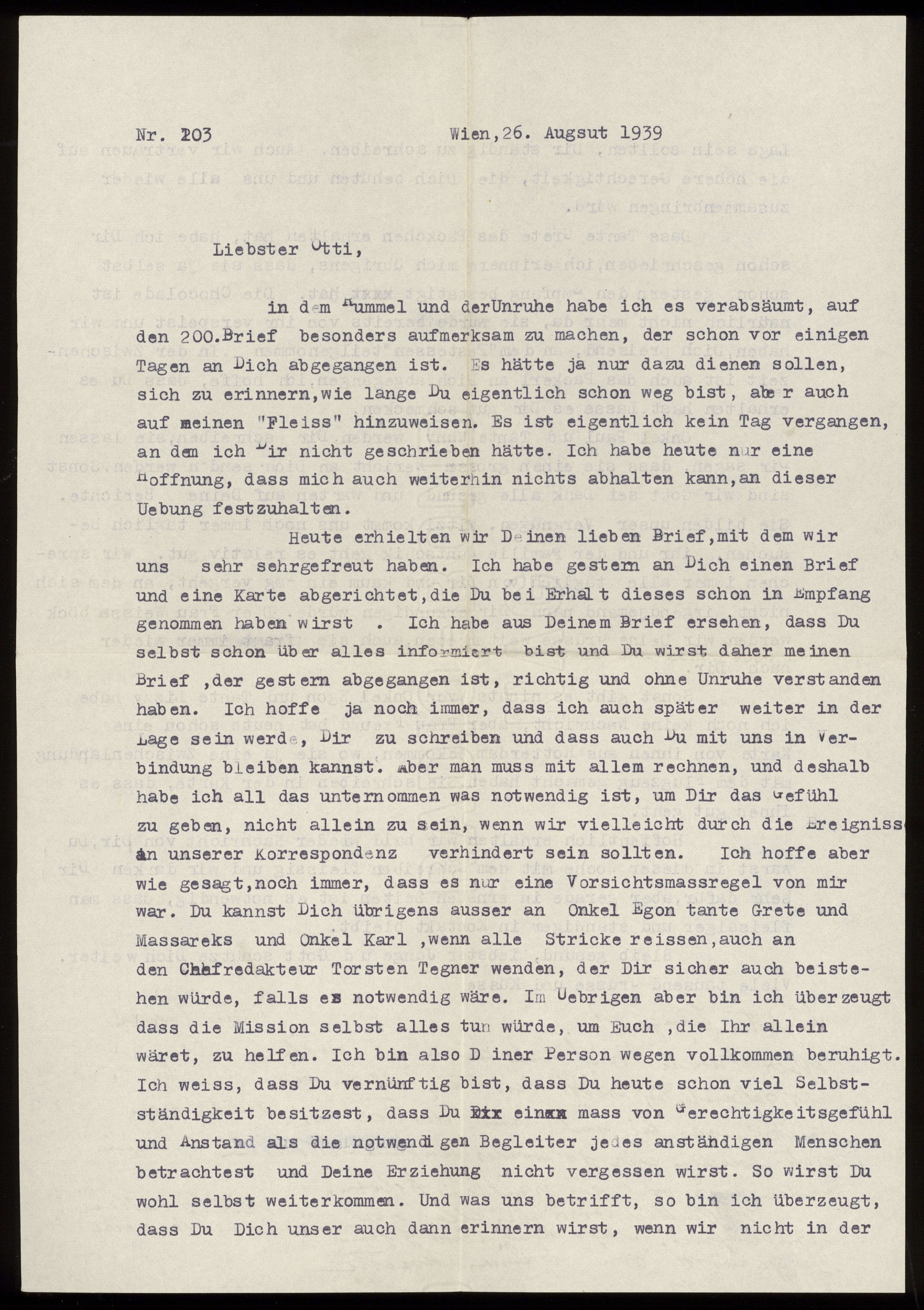 Maskinskrivet brev till Otto Ullman från föräldrarna Josef och Elise Ullmann daterat 26 augusti 1939 Wien.