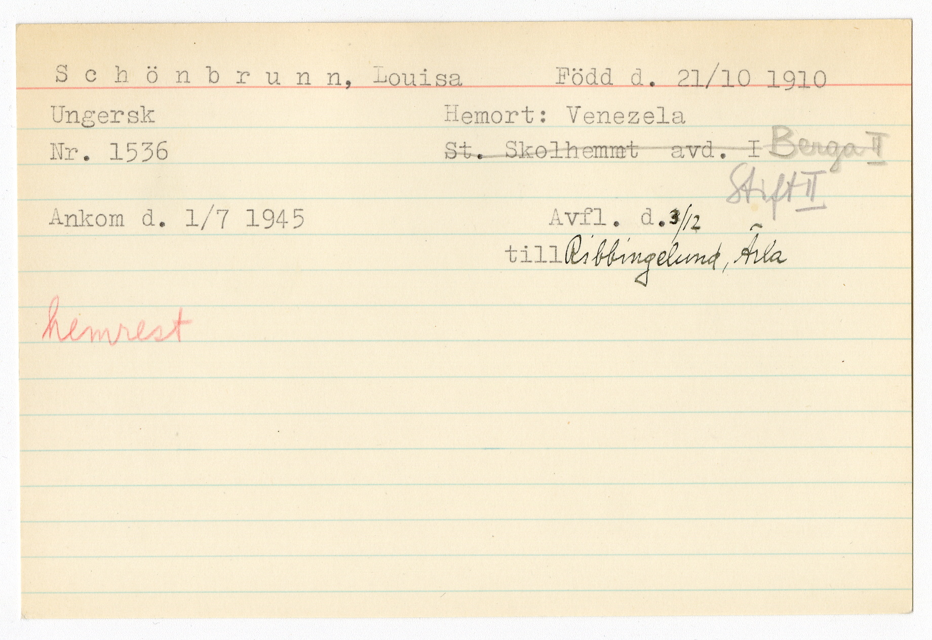 Ett skrivkort med patientuppgifter gällande Louisa Schönbrunn.
