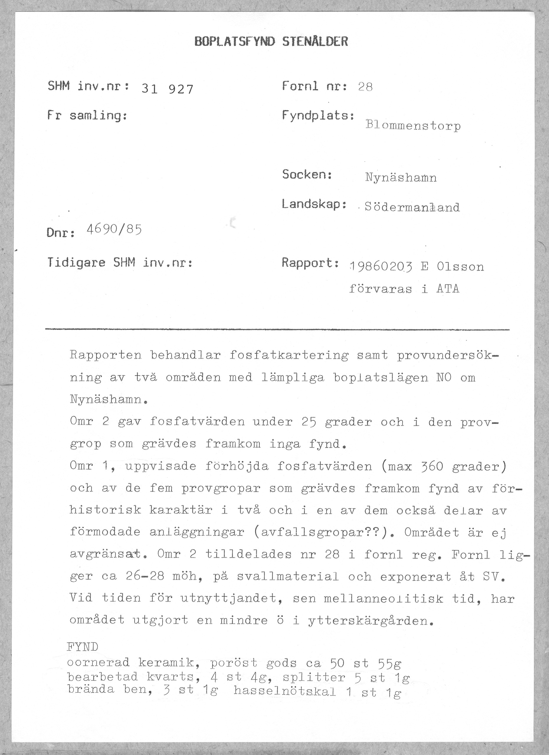 Rapport. Fosfatkartering och provundersökning av förmodade boplatslägen, Raä 28, Blommenstorp, Nynäshamns stad, Sö |