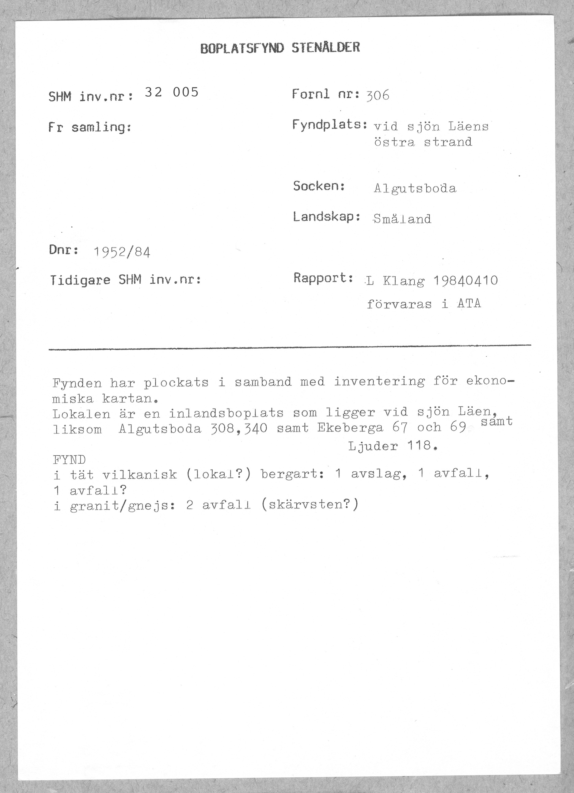 Rapport rörande tillvaratagna fynd av stenålderskaraktär vid fornminnesinventeringen för den ekonomiska kartan i Kalmar län, Småland, åren 1977-78 och 1980 |