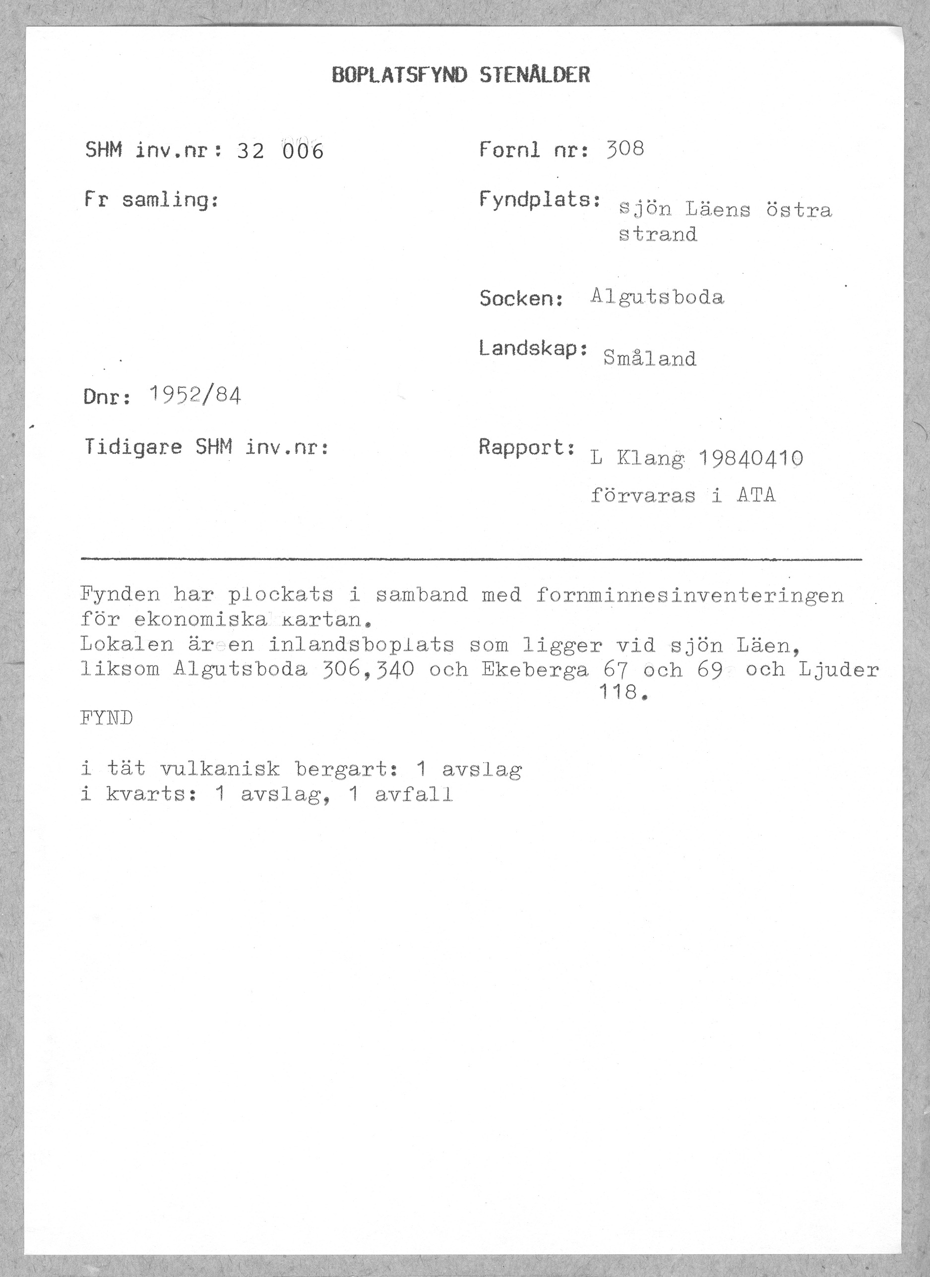 Rapport rörande tillvaratagna fynd av stenålderskaraktär vid fornminnesinventeringen för den ekonomiska kartan i Kalmar län, Småland, åren 1977-78 och 1980 |