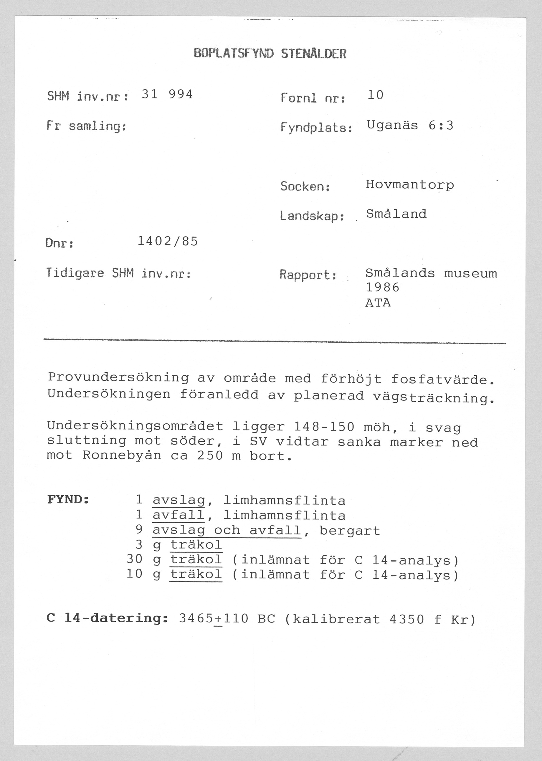 Rapport - Provundersökning av stenåldersboplats, Ugnanäs, Hovmantops socken, Småland |