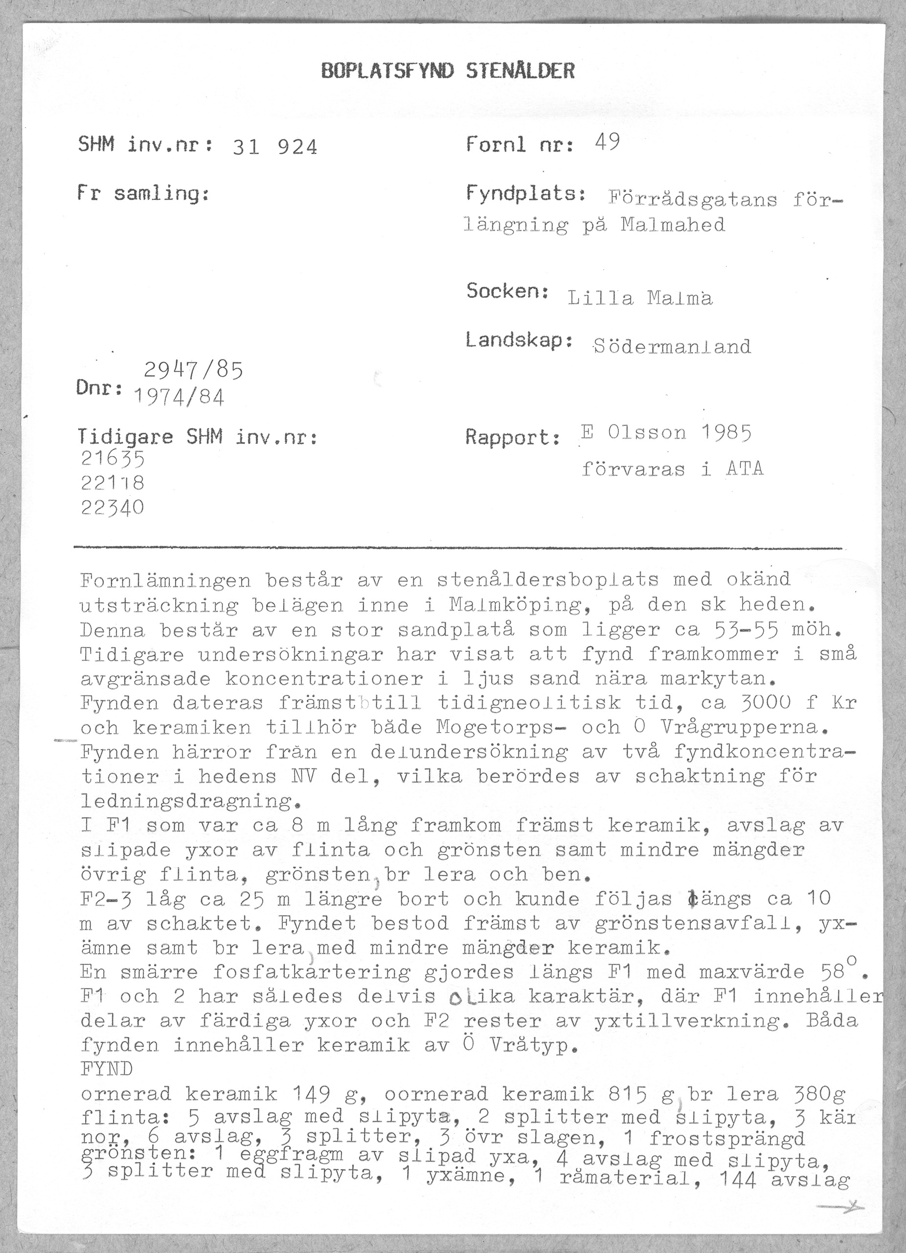 Rapport, Sö, Lilla Malma sn, Malmahed, Raä 49, stg 49 |