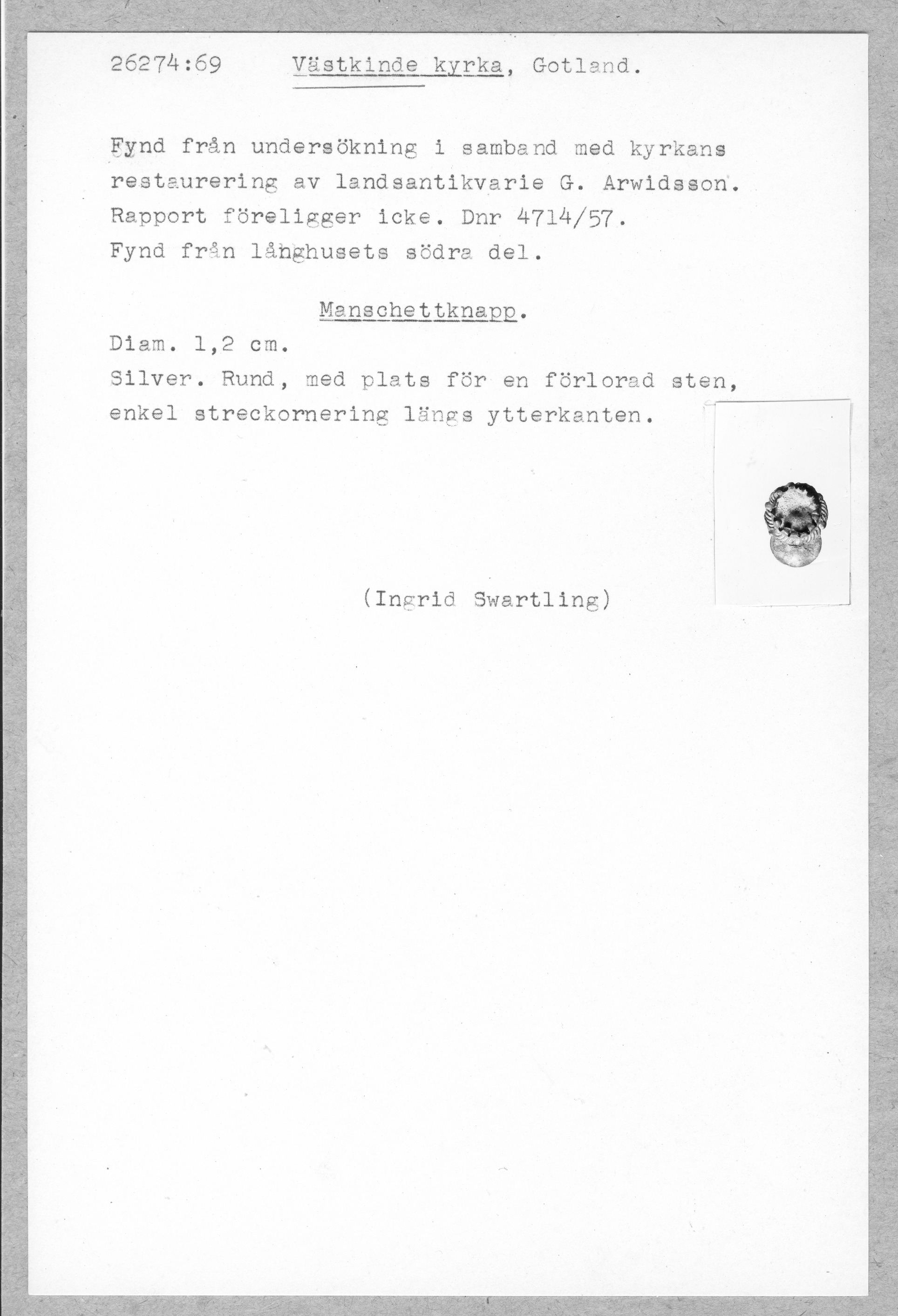 26274:69 \ Gotland \ Västkinde kyrka, Gotland. \ Manschettknapp \ Medeltid