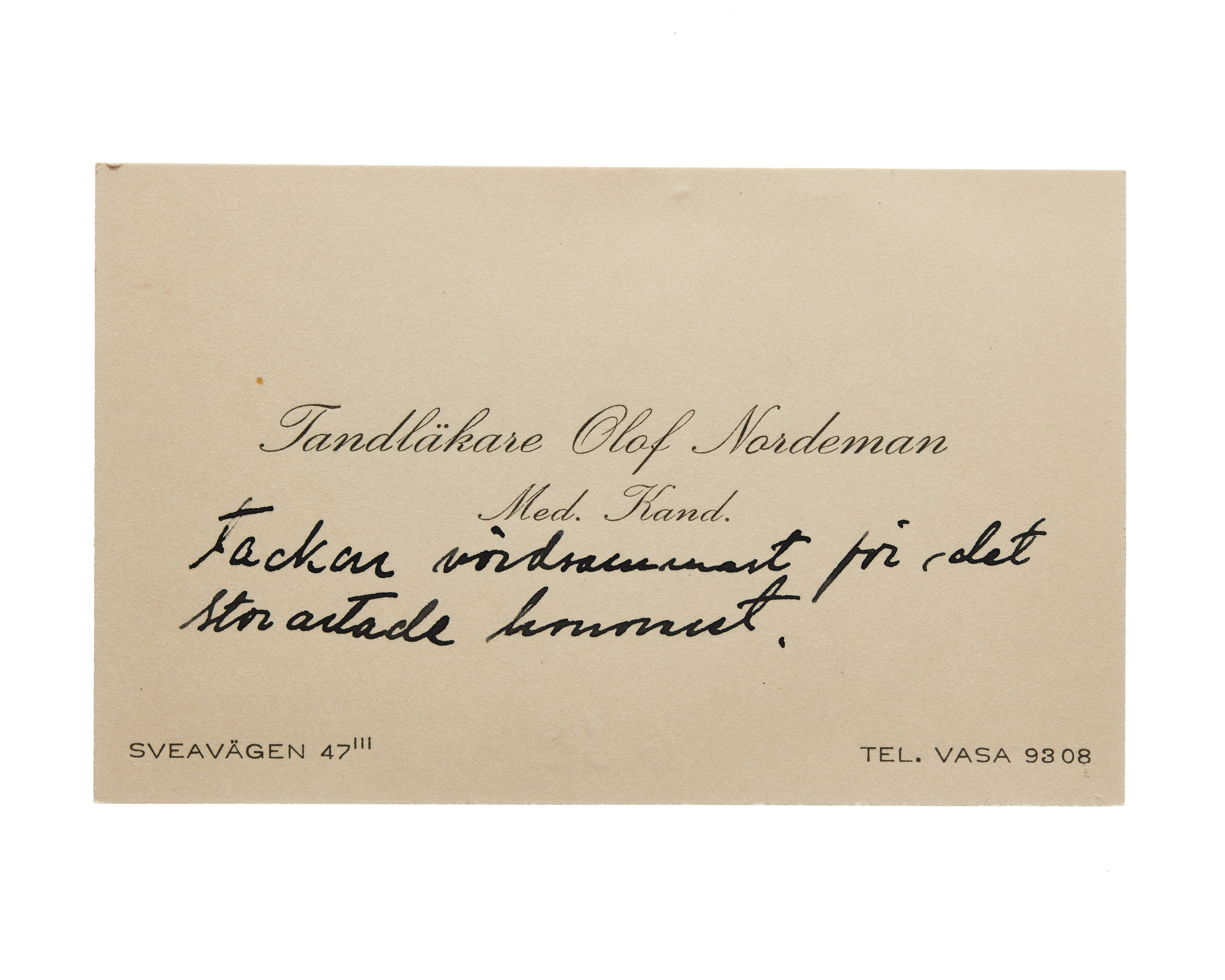Visitkort från Tandläkare Olof Nordeman, Med. Kand. Sveavägen 47.