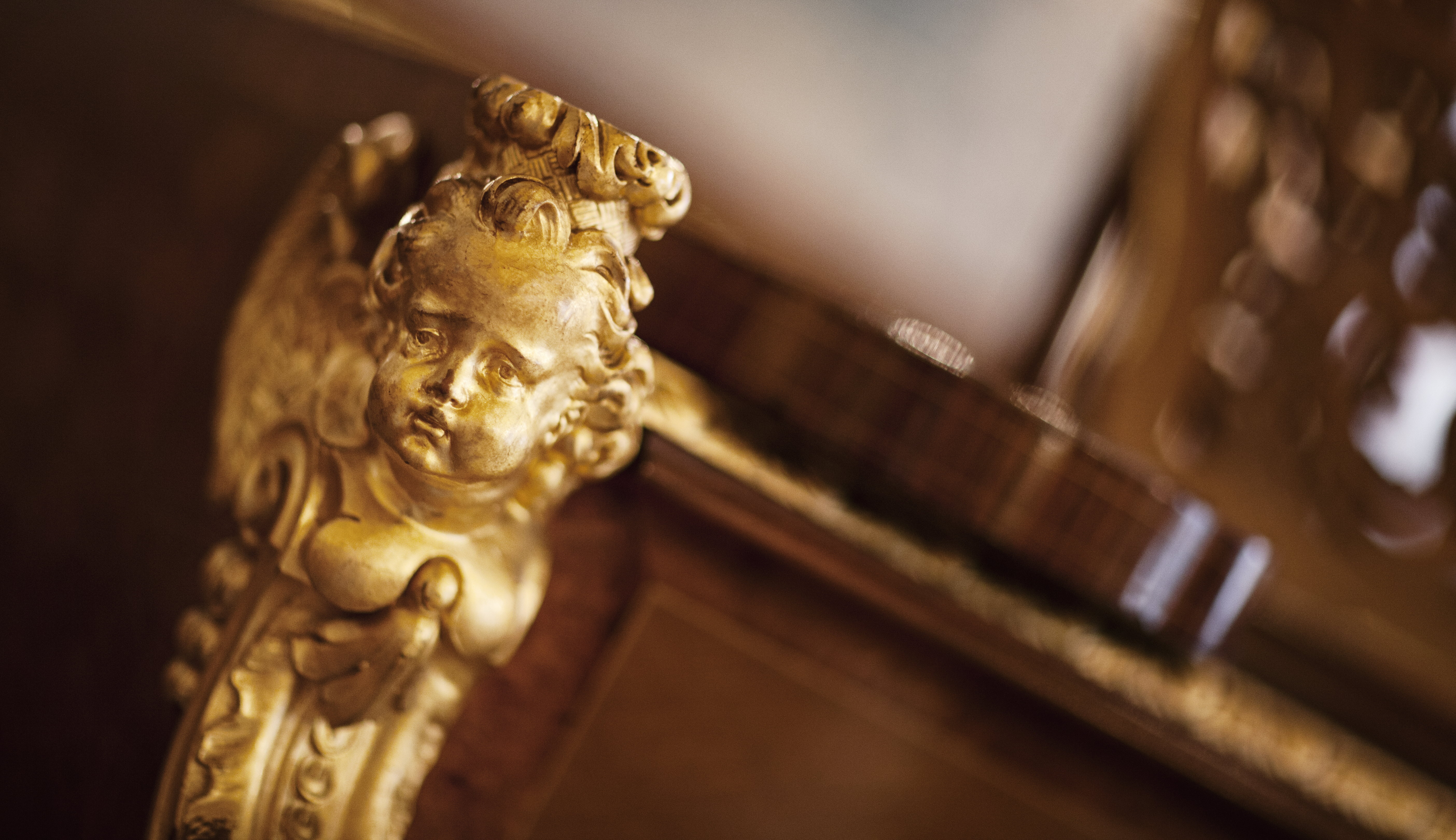Ansikte i guld som dekorerar flygel.