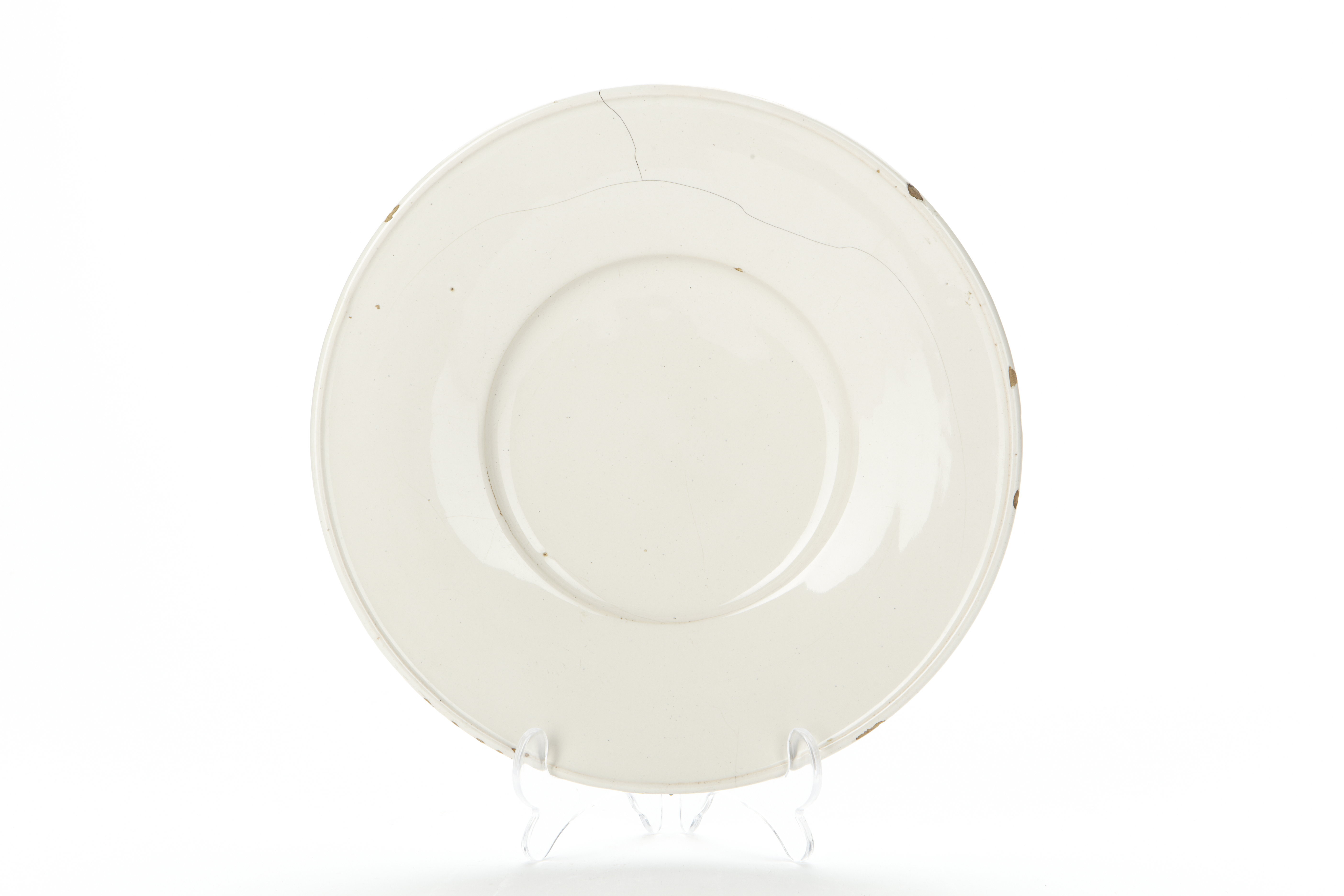 Flat tallrik av vitglaserad fajans från 1600-talet.