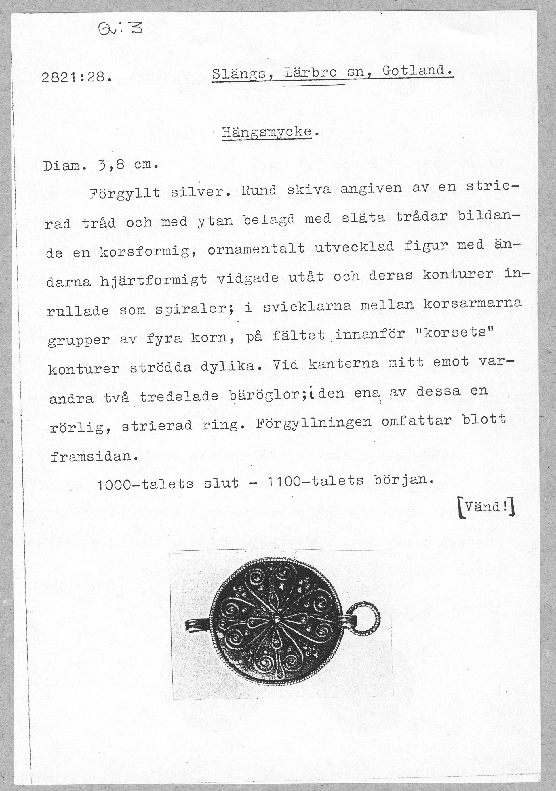 2821:28 \ Gotland \ Slängs, Lärbro sn, Gotland. \ Hängsmycke \ Medeltid