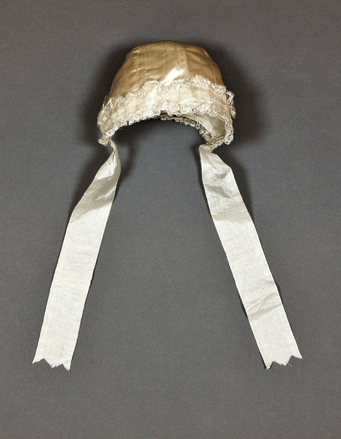 Plagg; kläder. Barnmössa av siden.