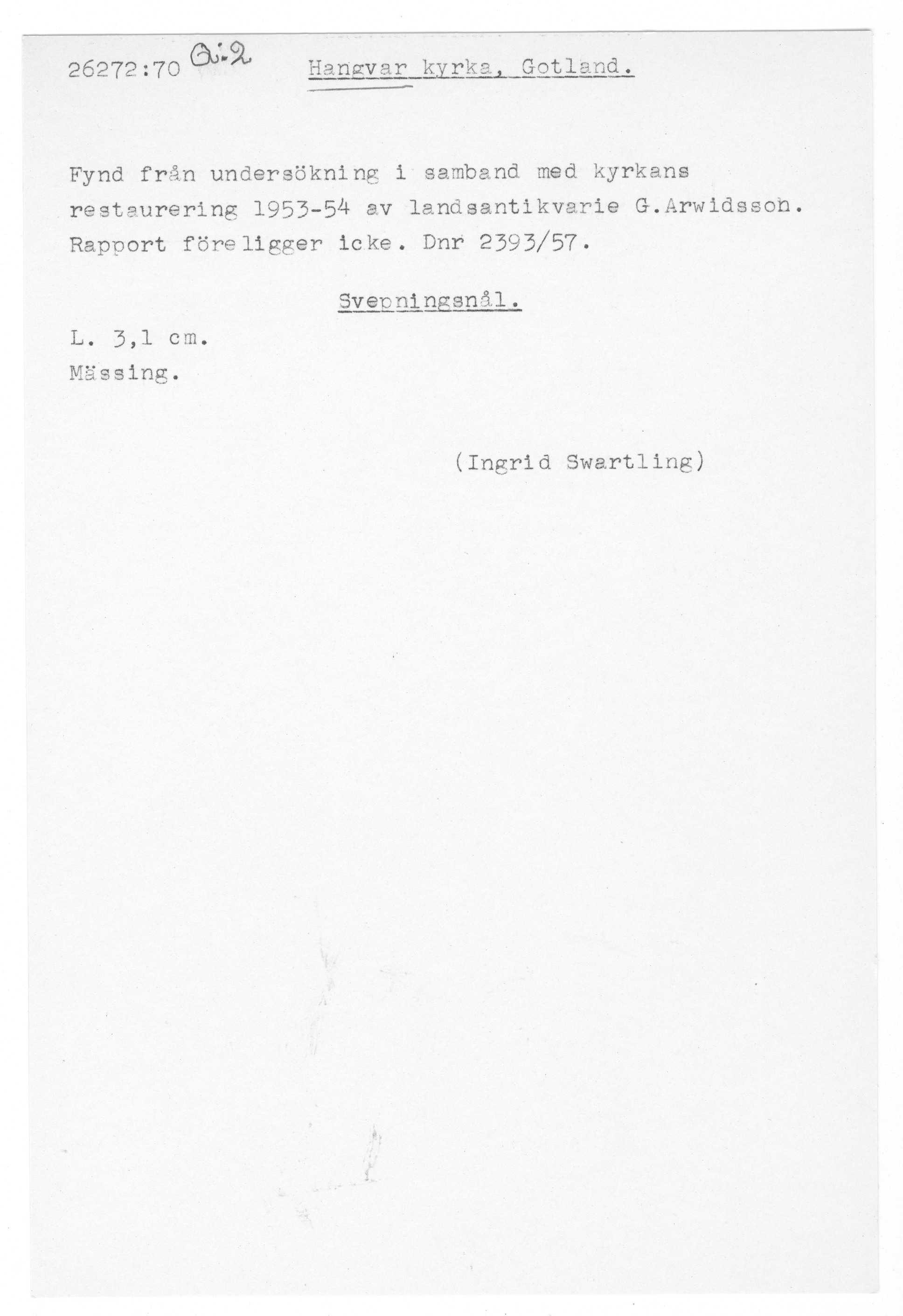 26272:70 \ Gotland \ Hangvar kyrka, Gotland. \ Svepningsnål \ Medeltid