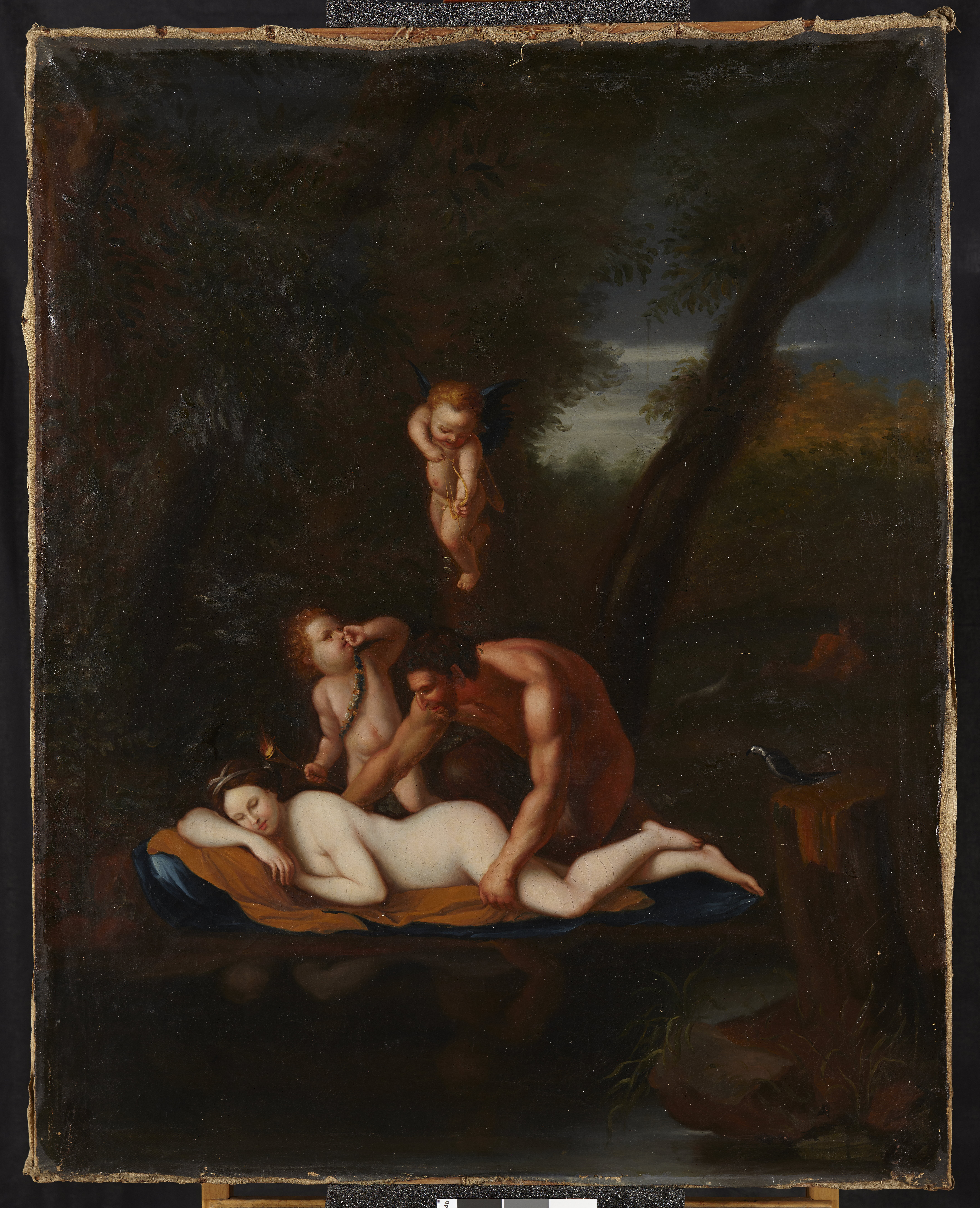 Målning föreställande Antiope liggande på marken och Jupiter sitter på huk över henne.