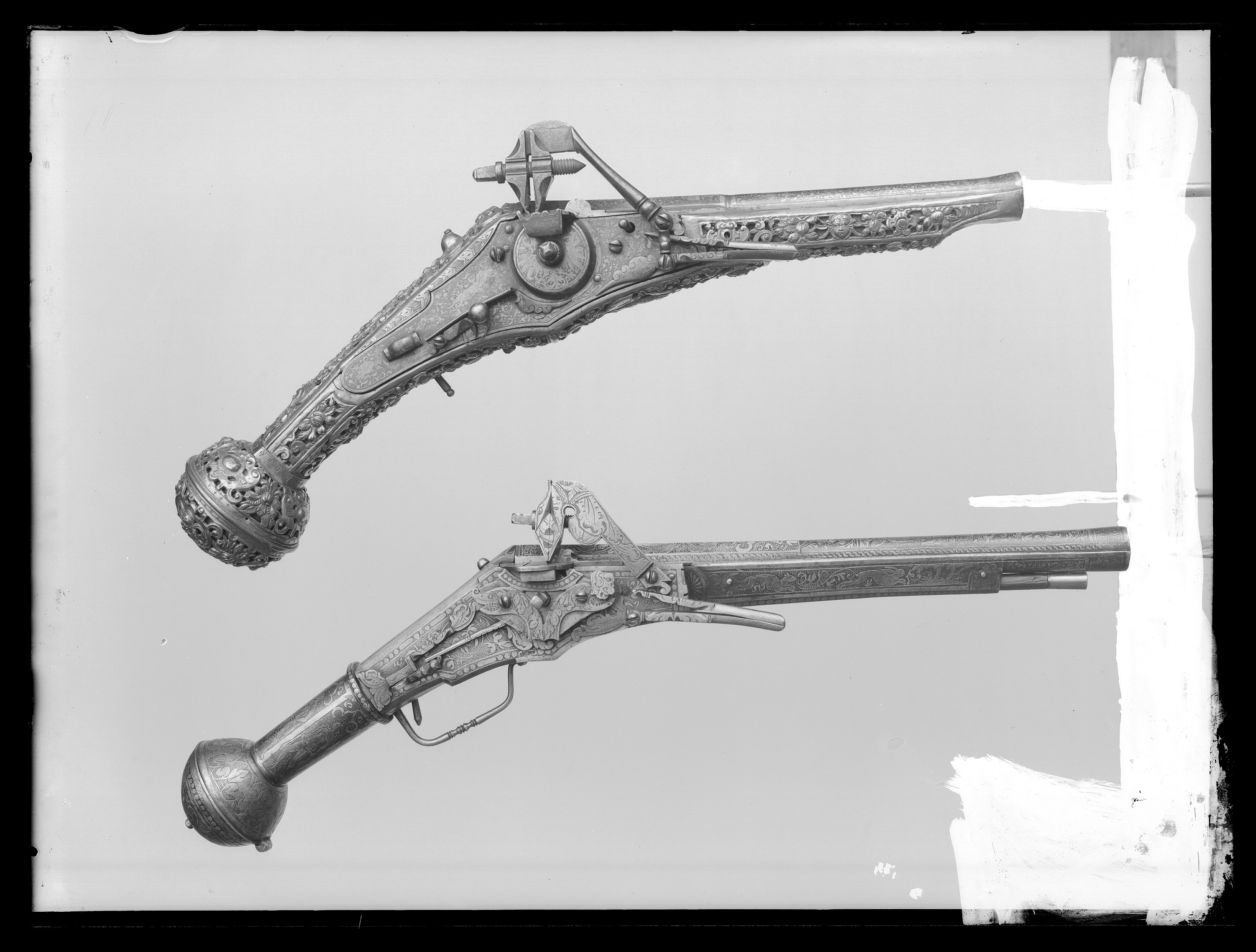 Hjullåspistoler från 1500-talets slut. Den övre är förgylld, den undre av stål.