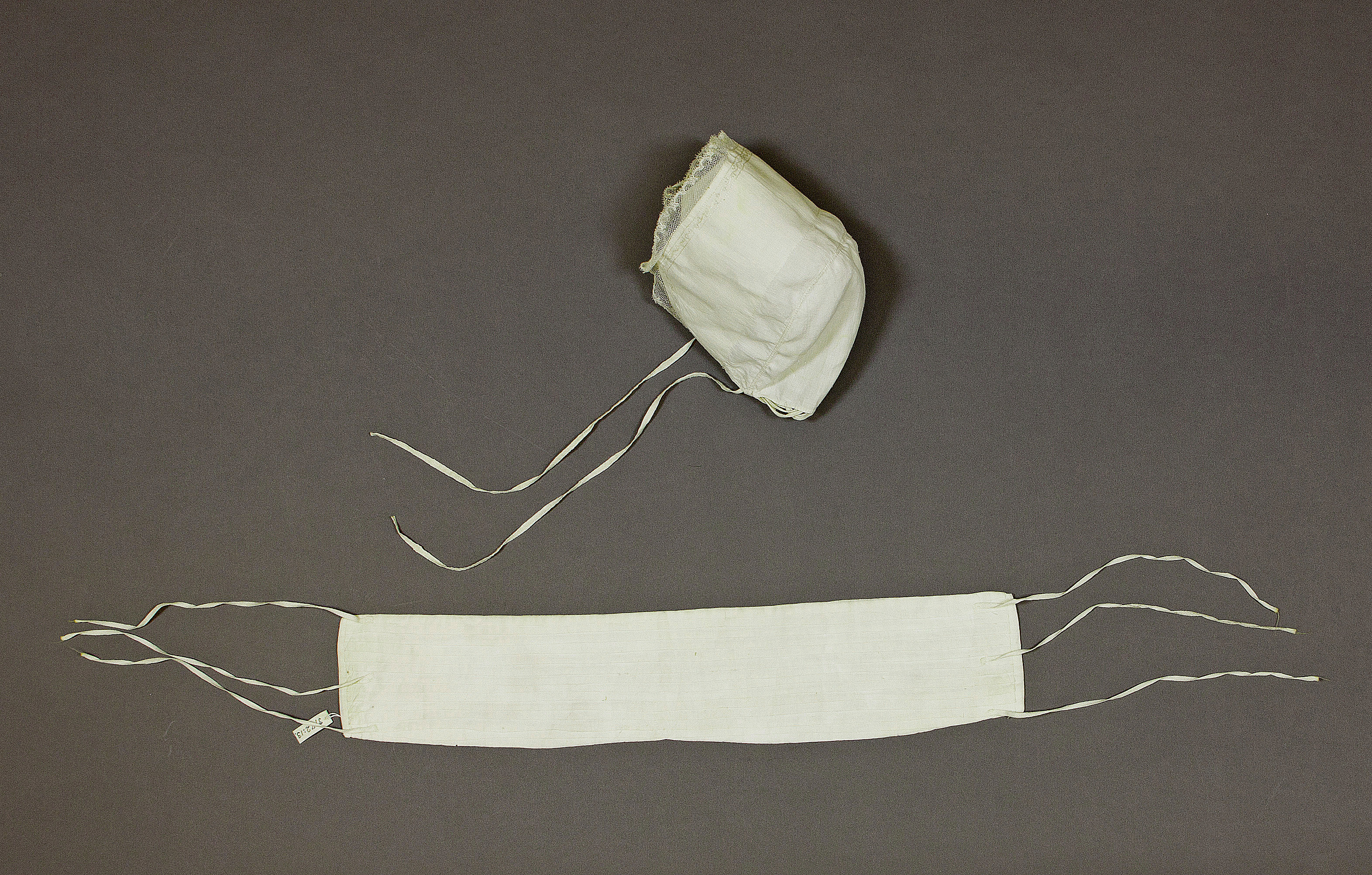 Plagg; Crèmefärgad barnmössa av linnelärft dekorerad med brysselspetsar.