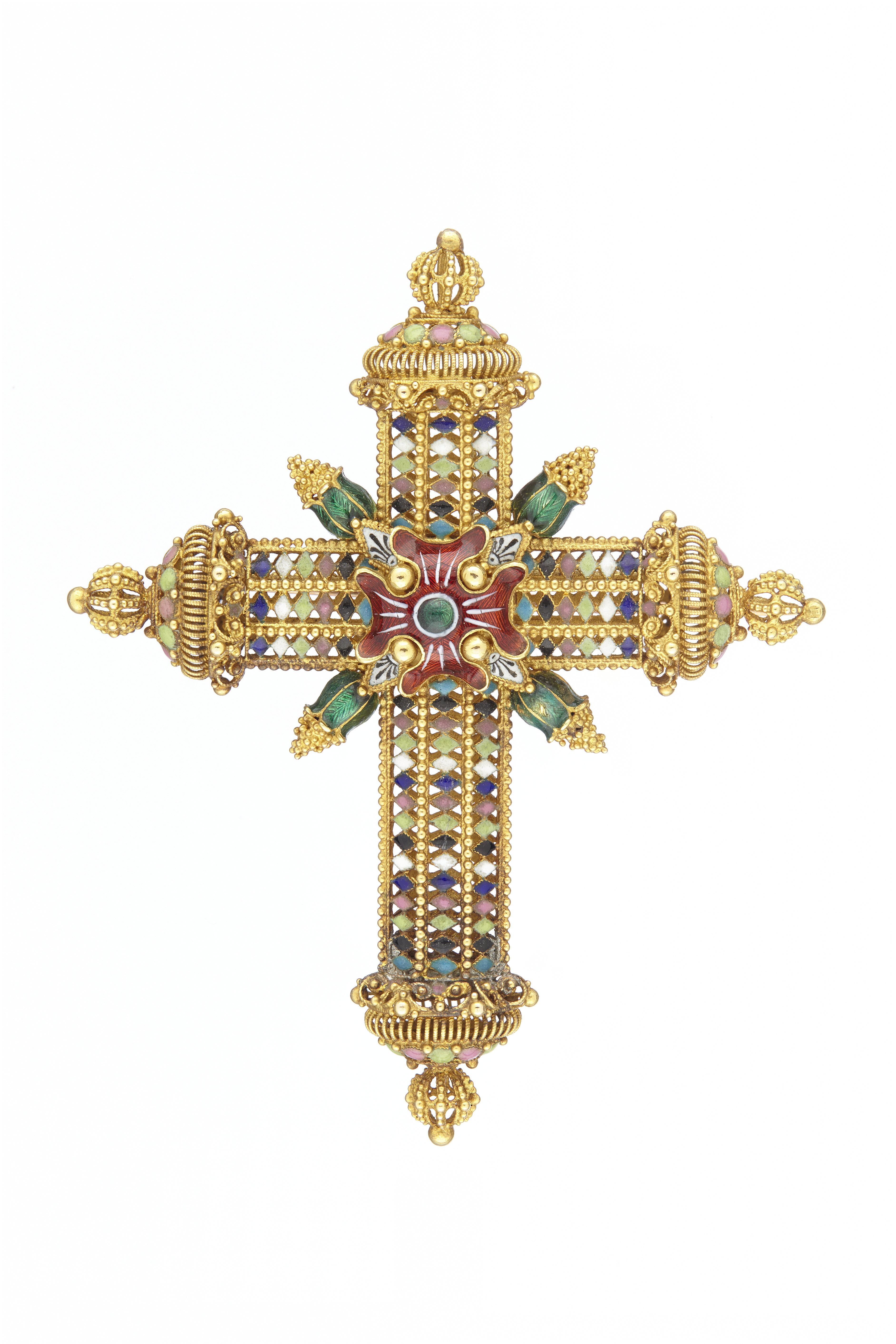 Brosch av guldtråd med polykrom emaljdekor. Dräktsmycke från 1800-talet.
