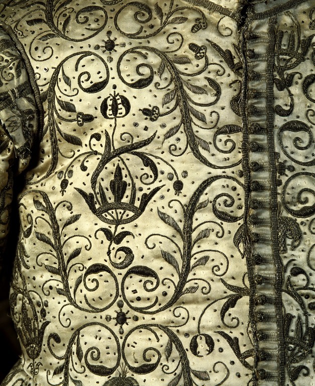 Tröja från 1617 tillhörande Gustav II Adolfs kröningsdräkt gjord av sidenatlas.