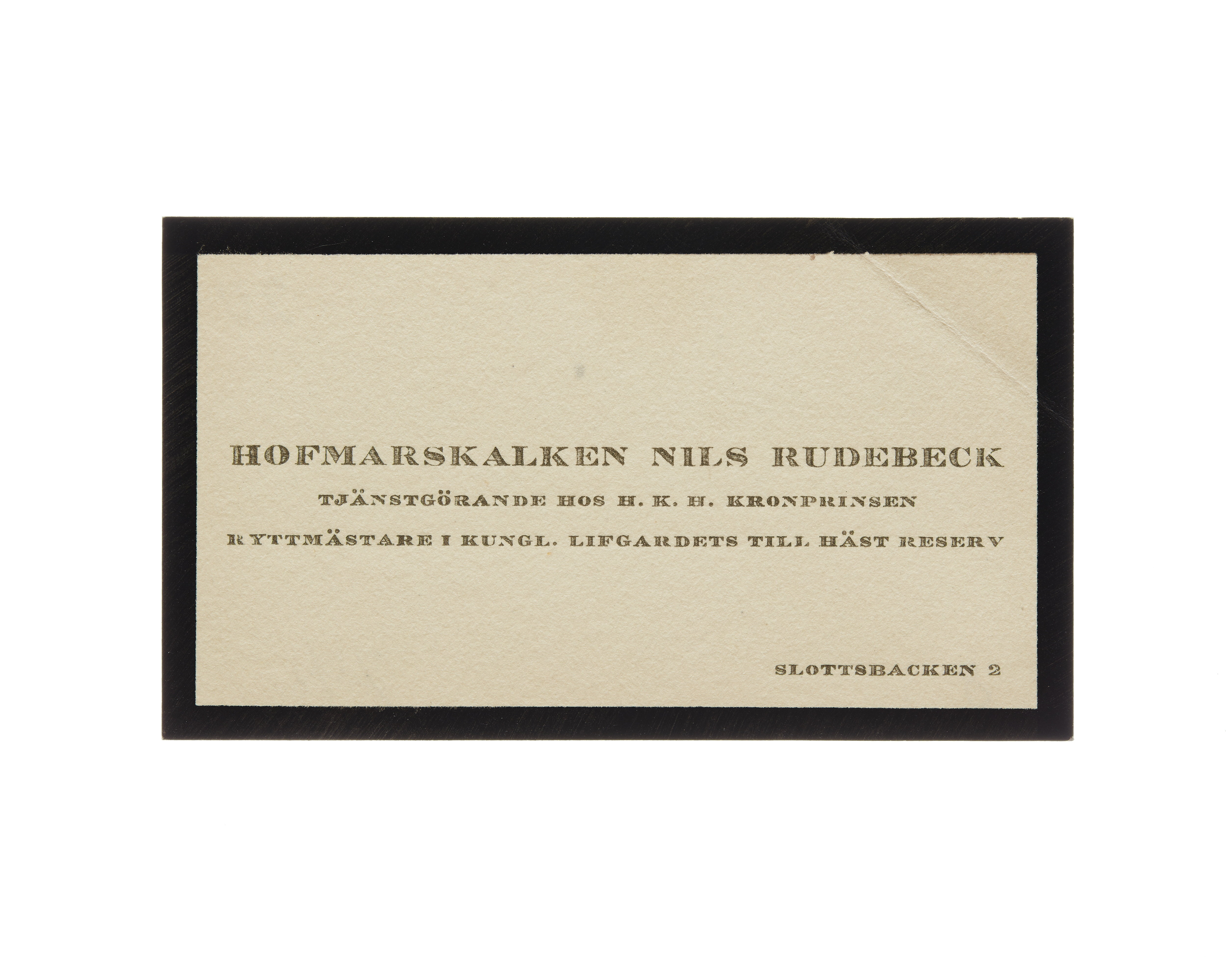 Visitkort från Hovmarskalken Nils Rudebeck. Tjänstgörande hos H. K. H. Kronprinsen. Ryttmästare hos kungl. livgardets till häst reserv.