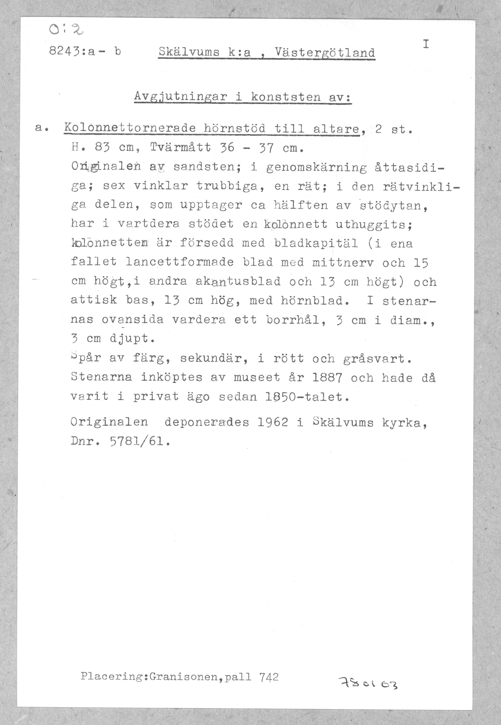 8243: \ Västergötland \ Skälvumsk:a, Västergötland \ Avgjutningar i konststenav:Kolonettornerade hörnstöd till altare \ Medeltid
