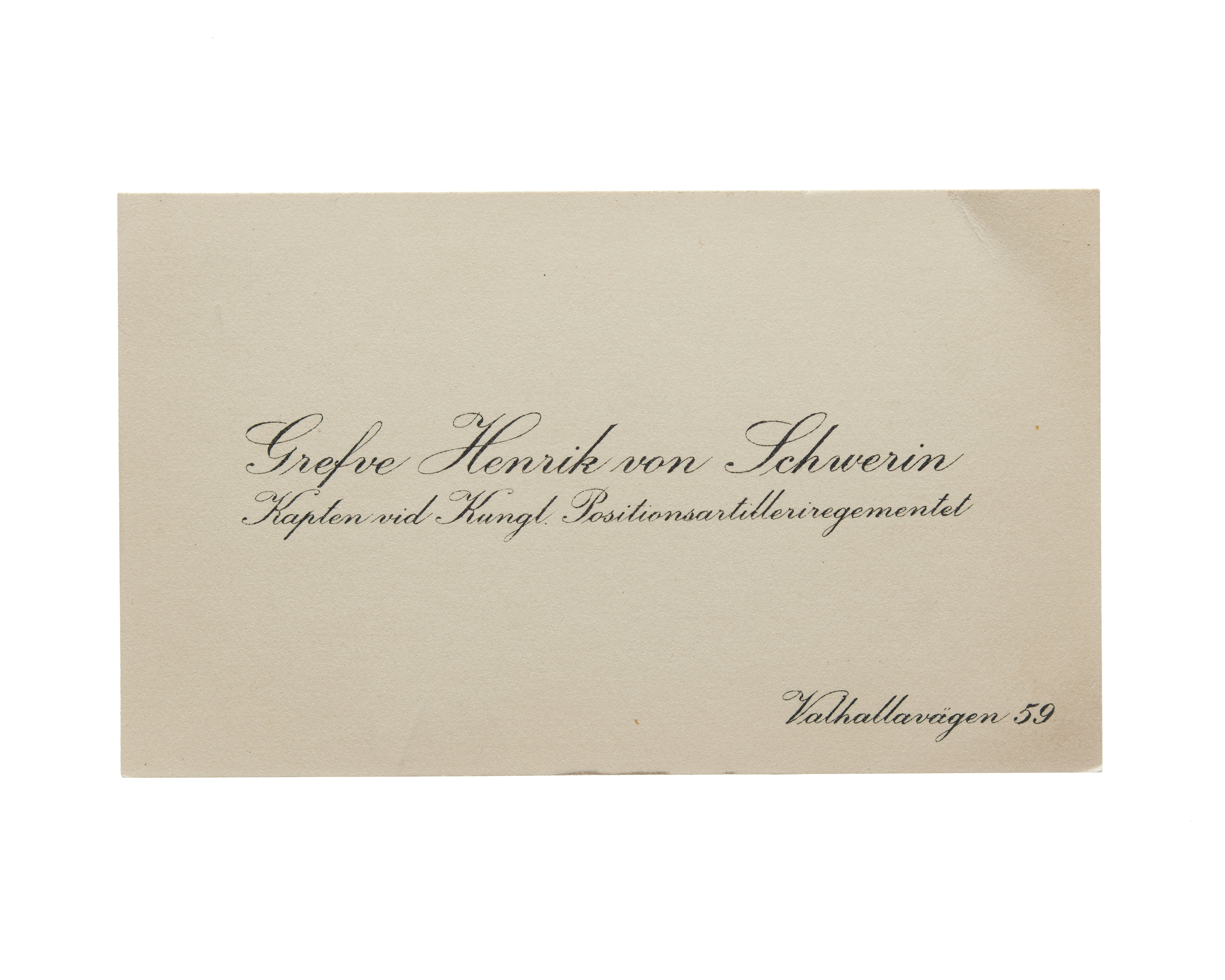Visitkort från Greven Henrik von Schwerin, Kapten vid Kungl. Positionsartilleriregementet, 1919. Valhallavägen 59.
