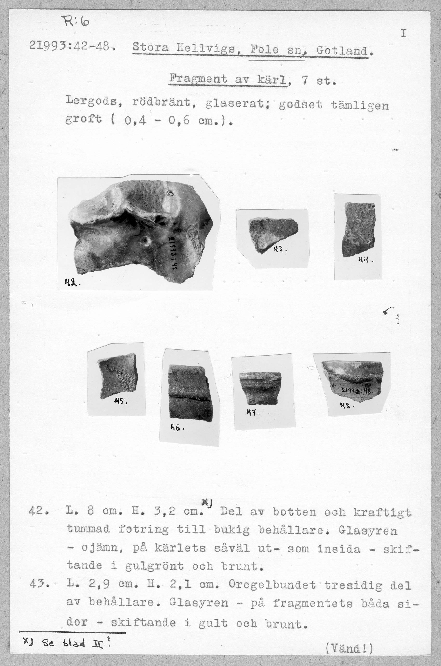21993:42-48 \ Gotland \ Stora Hellvigs, Fole sn. Gotland. \ Fragment av kärl \ Medeltid