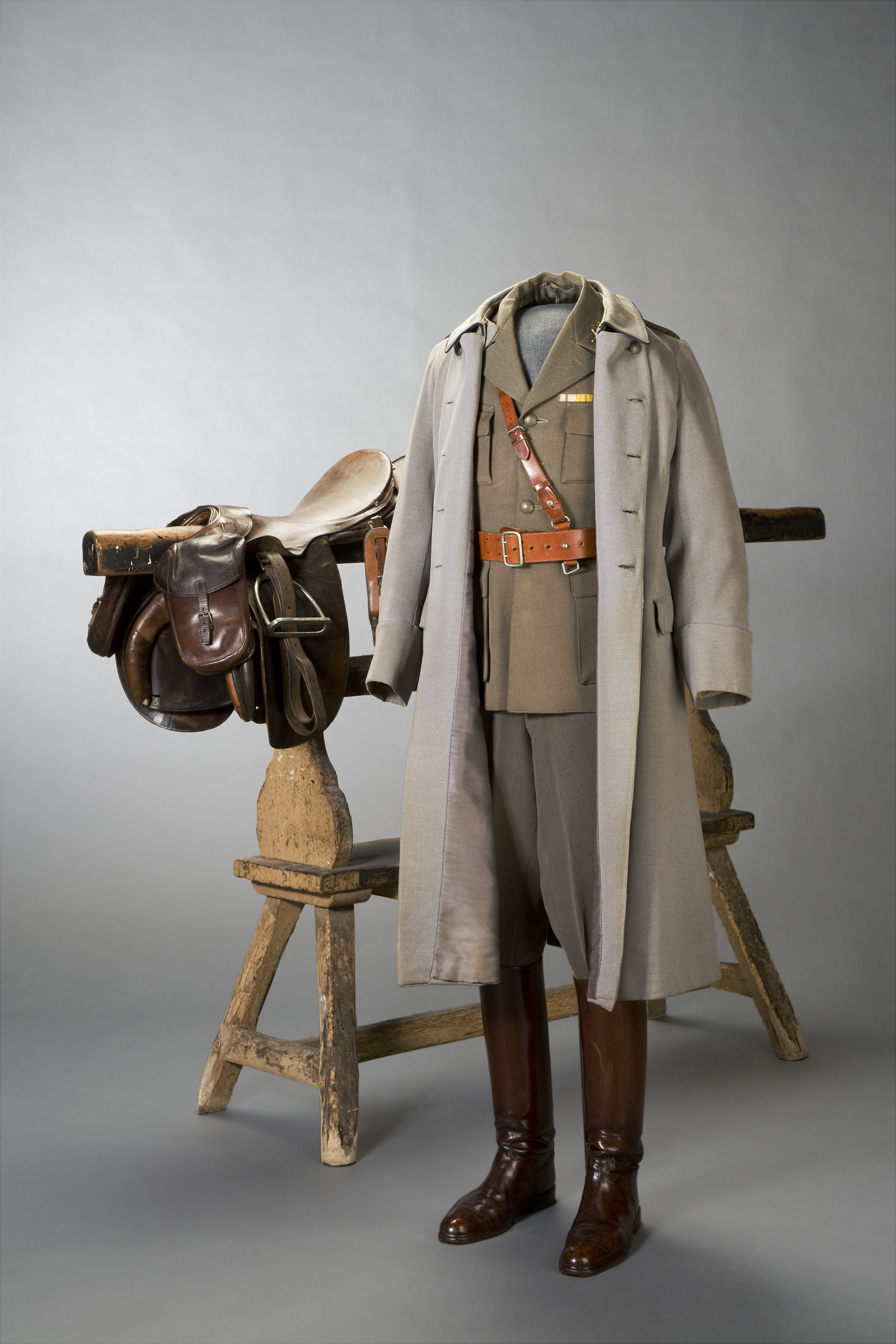 Uniformskappa, ridbyxor Generalstaben 1939, vapenrock, axelklaffar, sabelkoppel, stövlar, officerssadel, packväskor, stigbyglar