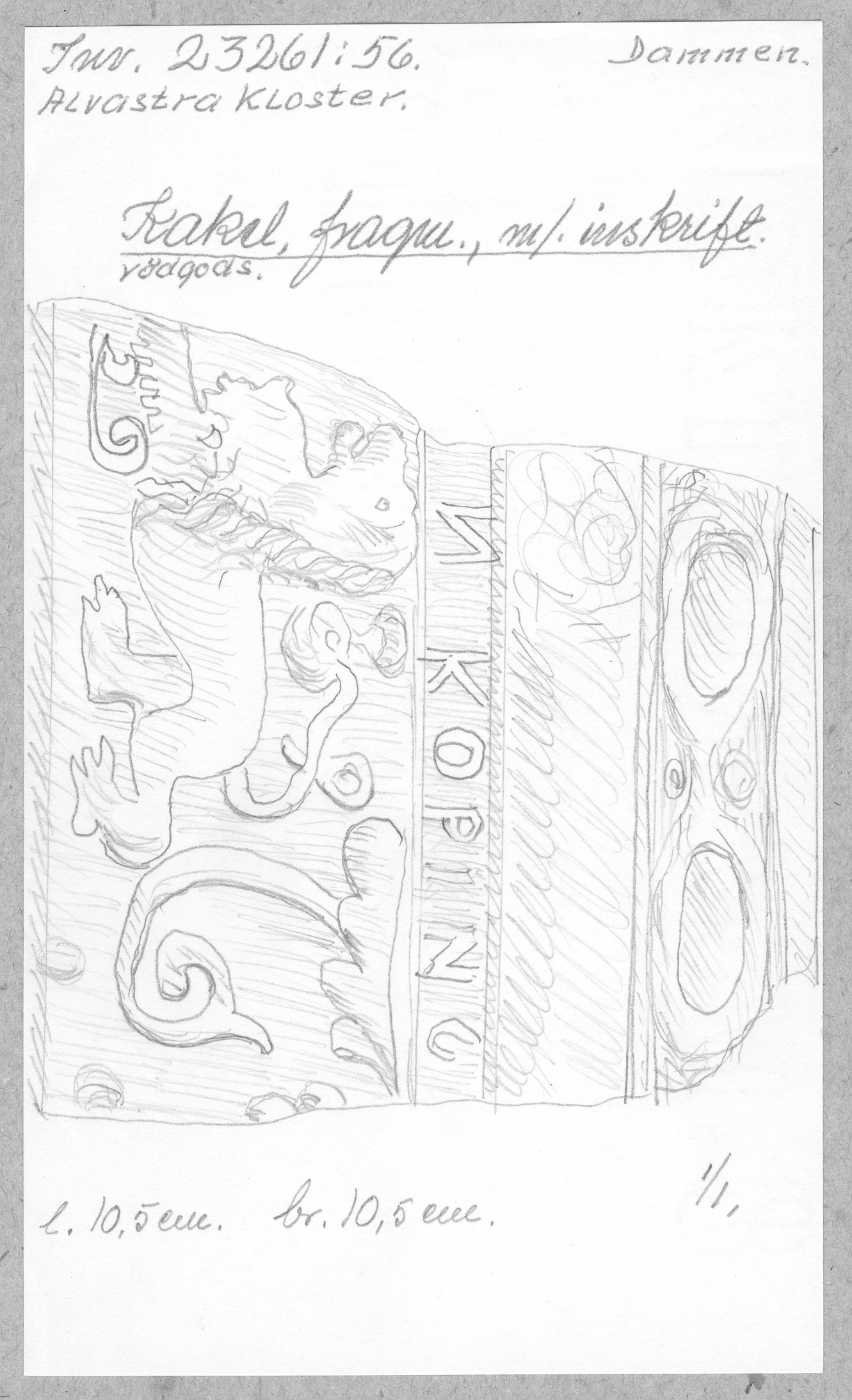 Ög, Västra Tollstad, Alvastra kloster. Kakel, fragm. m. Inskrift