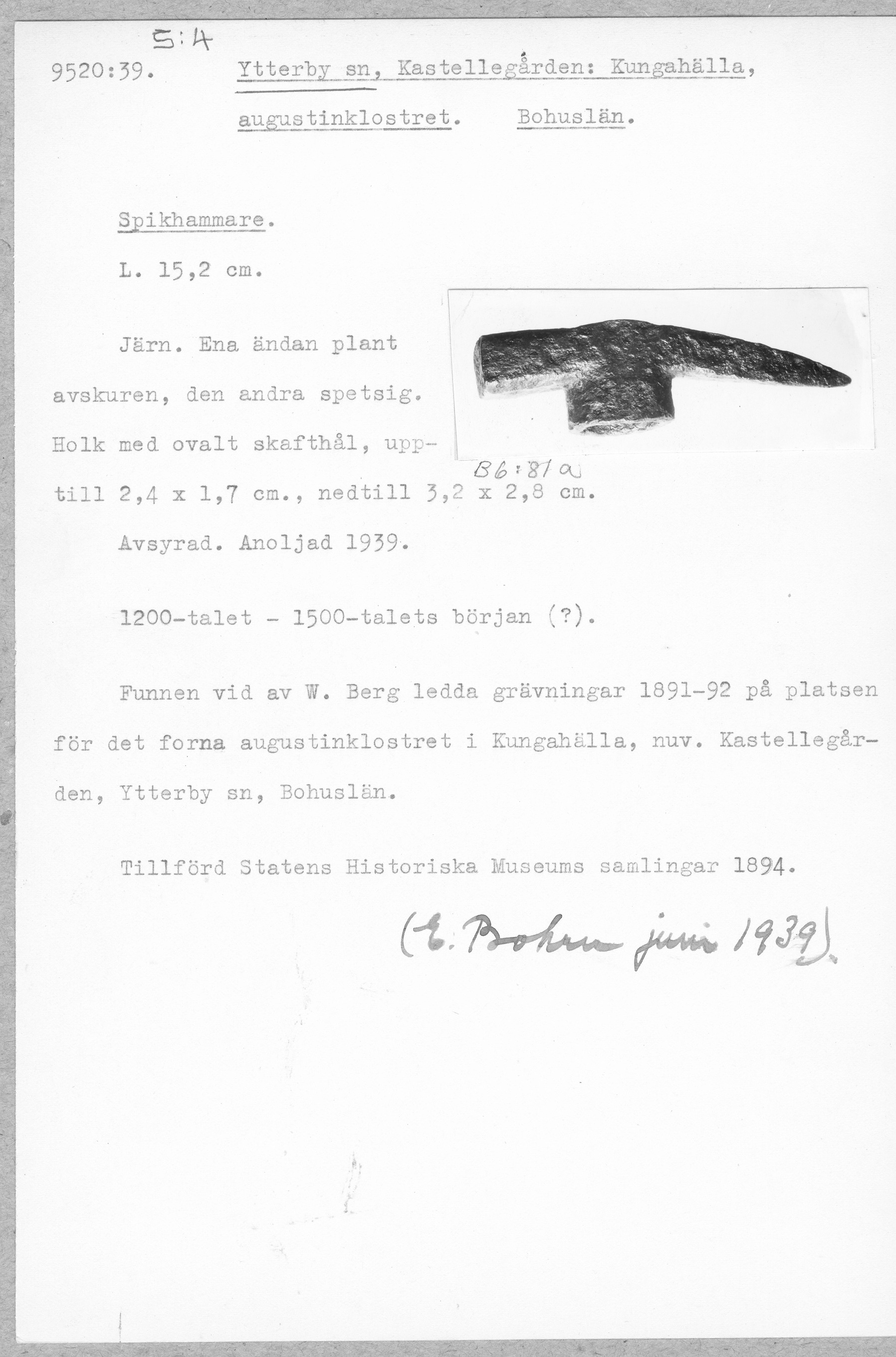 9520:39 \ Bohuslän \ Ytterby sn, Kastellegården: Kungahälla, augustinklostret. Bohuslän. \ Spikhammare \ Medeltid
