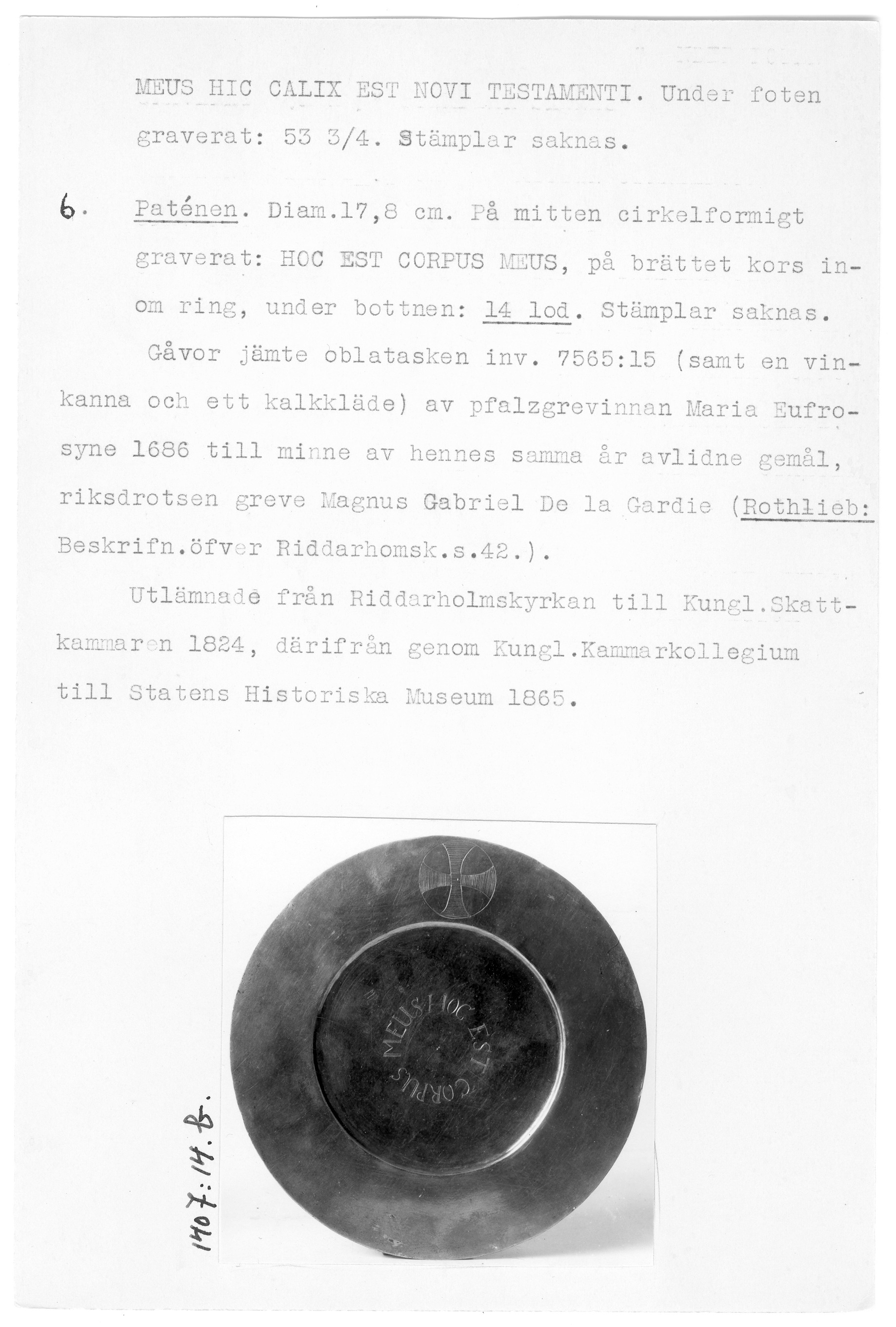 7565:5-6 \ Uppland \ Stockholm, Riddarholmskyrkan. \ Kalk och patén Förgyllt silver \ Medeltid