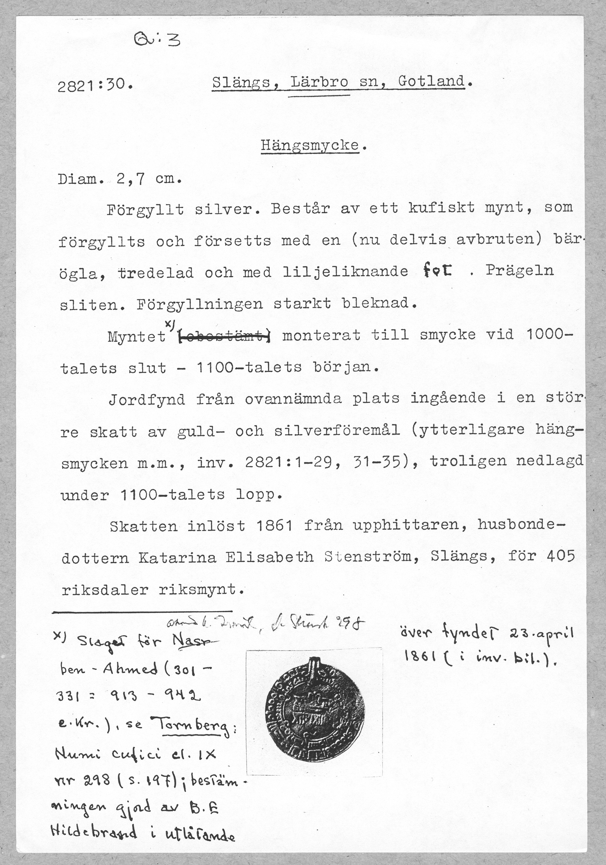 2821:30 \ Gotland \ Slängs, Lärbro sn, Gotland. \ Hängsmycke \ Medeltid