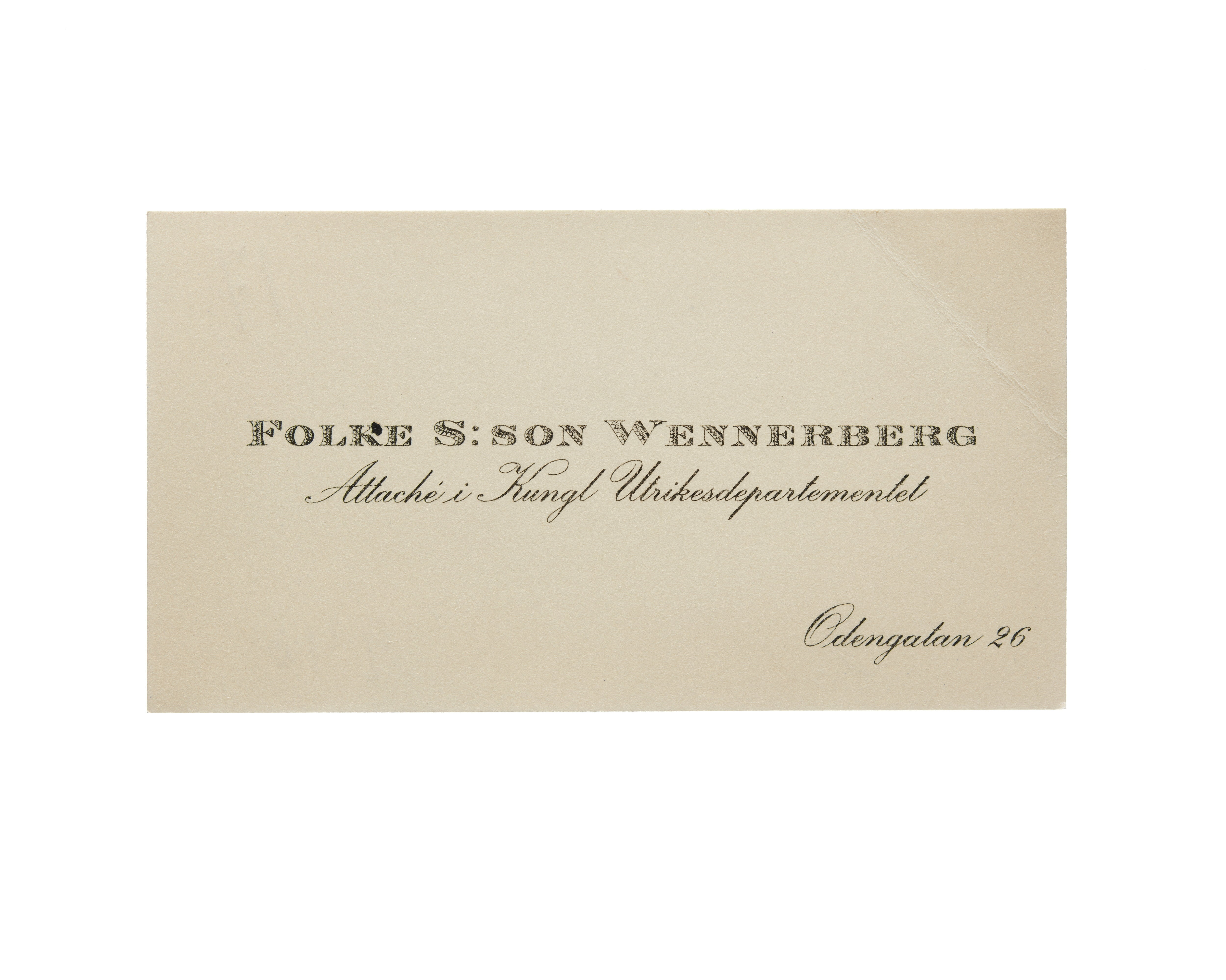 Visitkort från Folke S:son Wennerberg, Attaché i Kungl. Utrikesdepartementet. Odengatan 26.