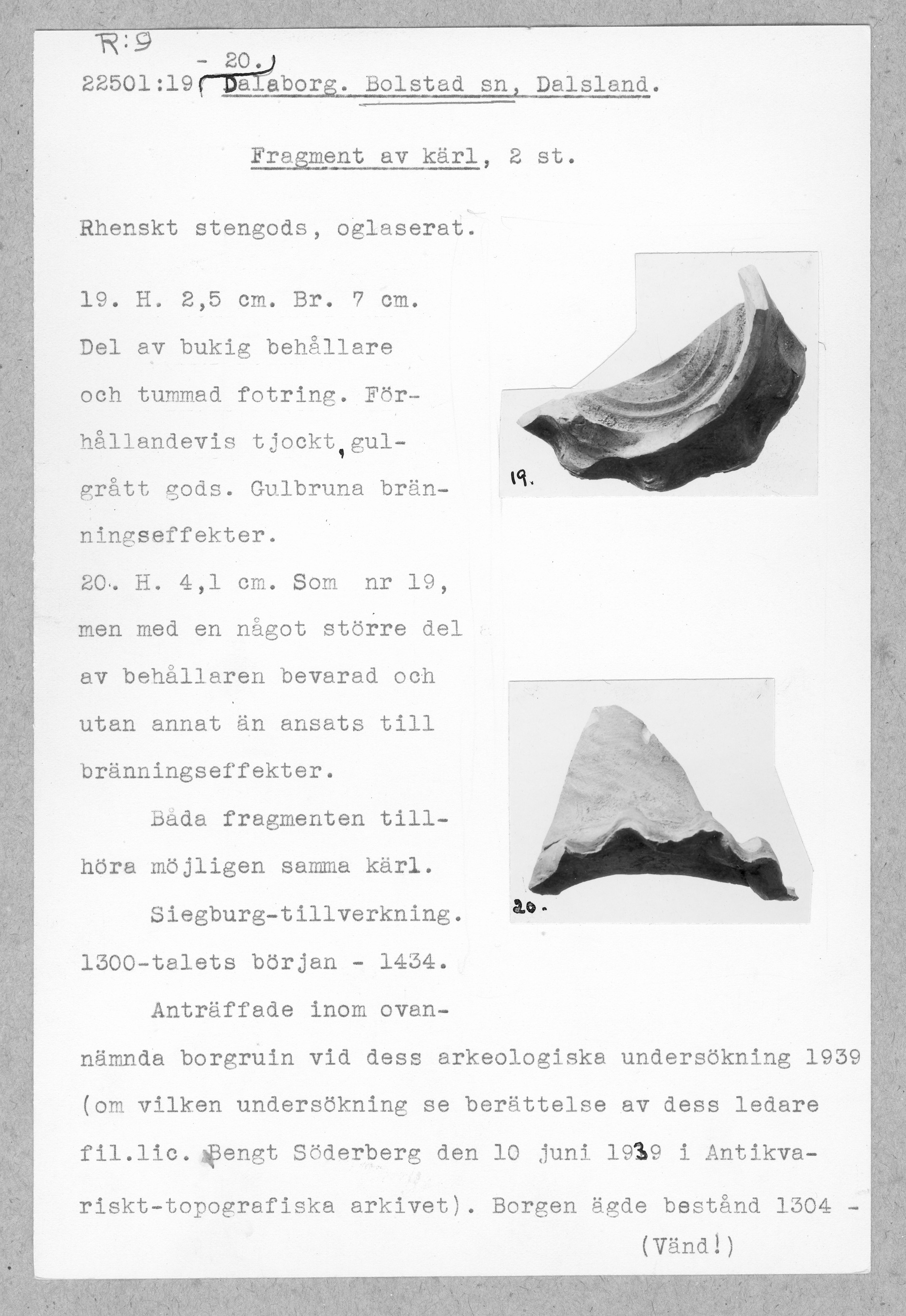 22501:19-20 \ Dalsland \ Dalaborg. Bolstad sn, Dalsland. \ Fragment av kärl, 2 st \ Medeltid