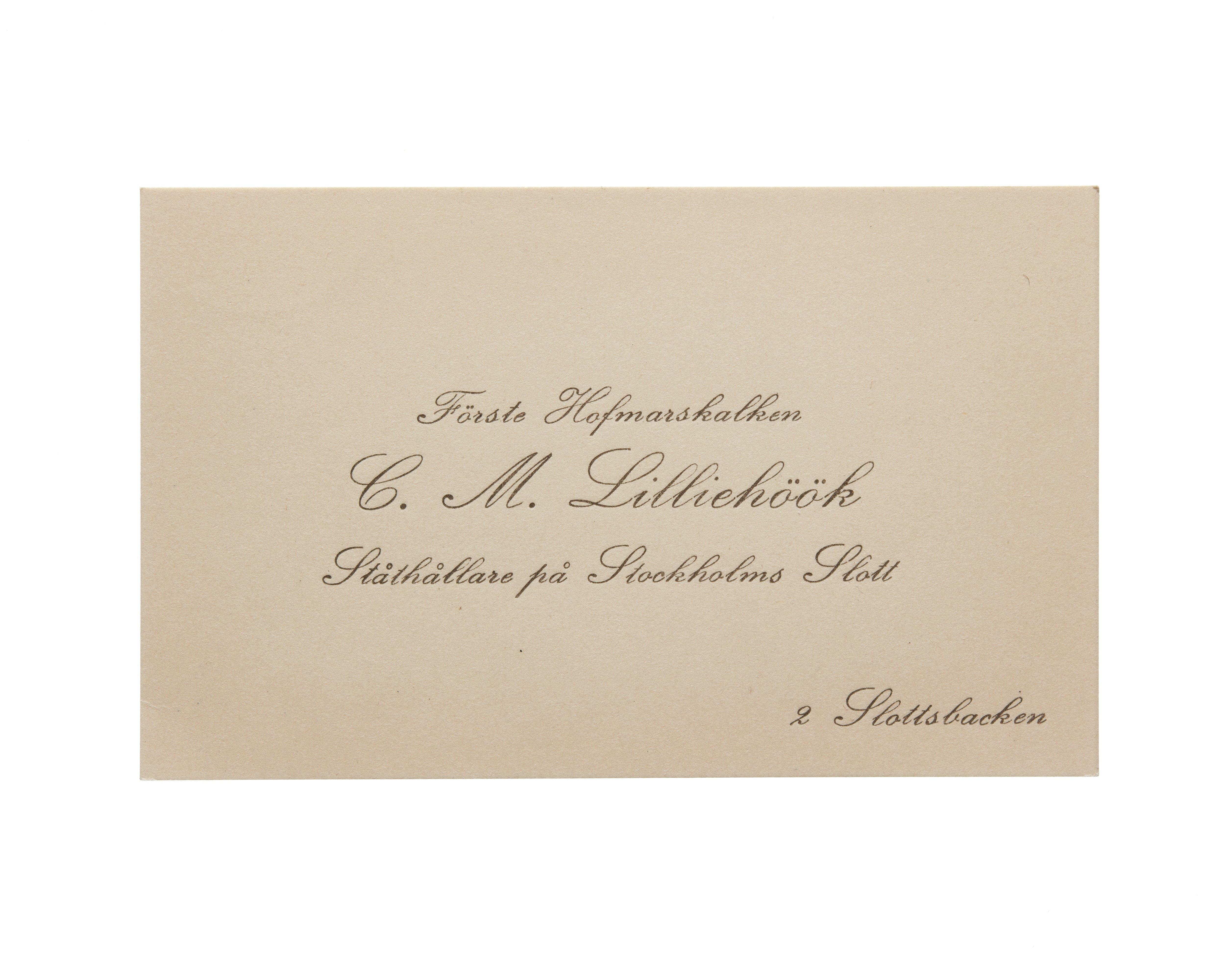 Visitkort från Förste Hovmarskalken C. M. Lilliehöök, Ståthållaren på Gripsholms slott.