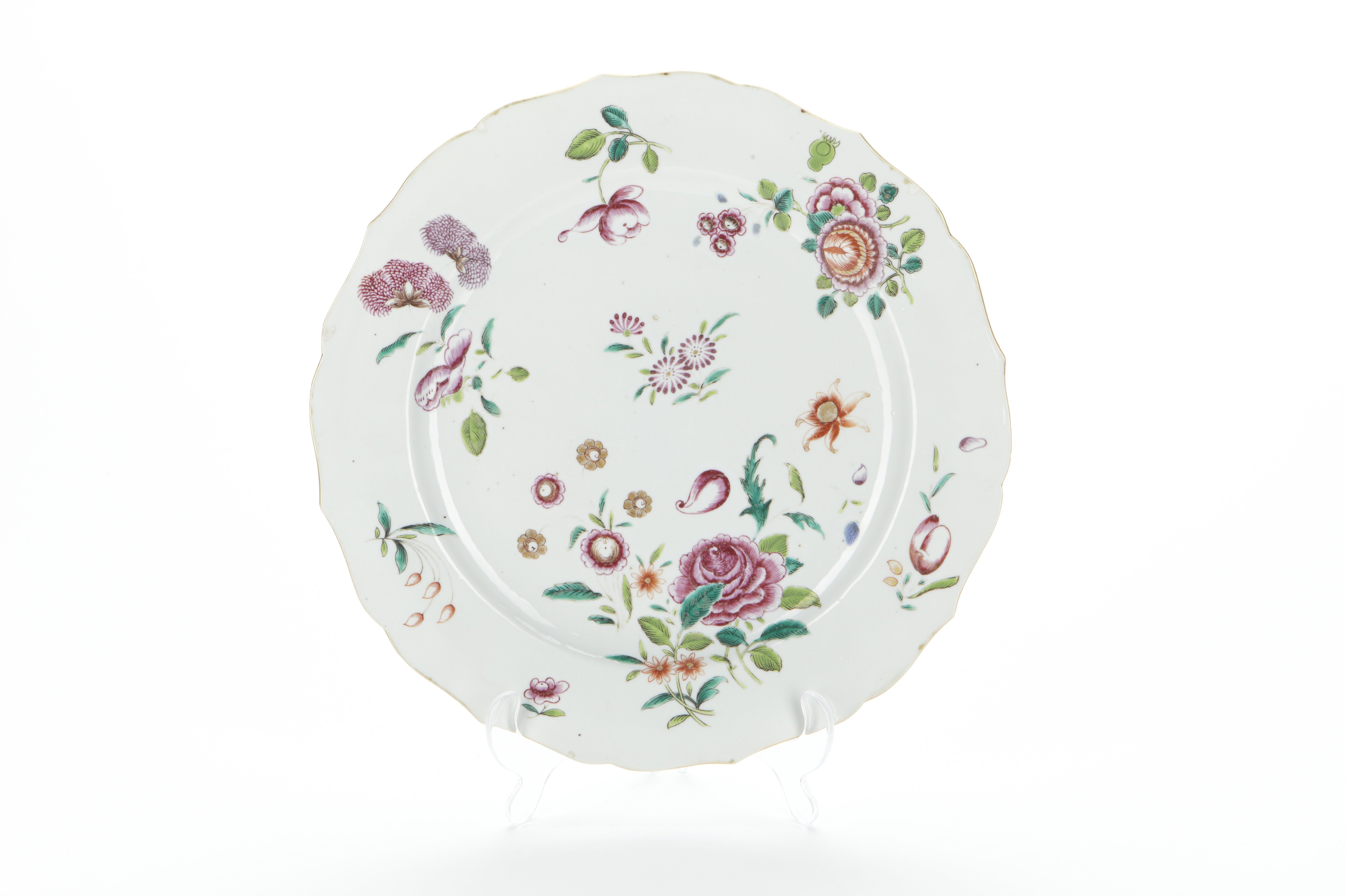 Blommigt porslinsfat från 1750-talet med rosor och nejlikor.