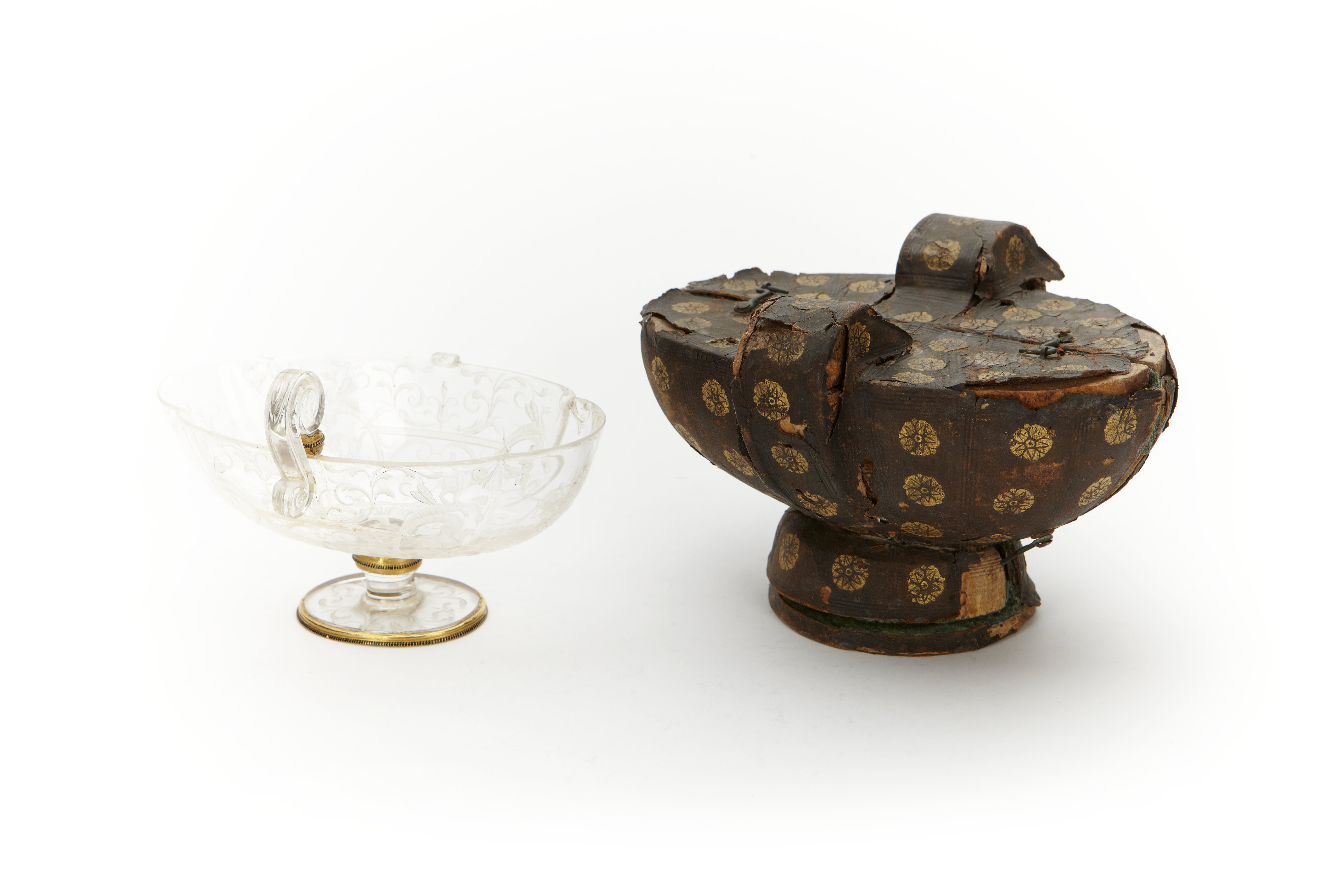 Skål av bergskristall och tillhörande fodral klätt i svart skinn med guldtryck.