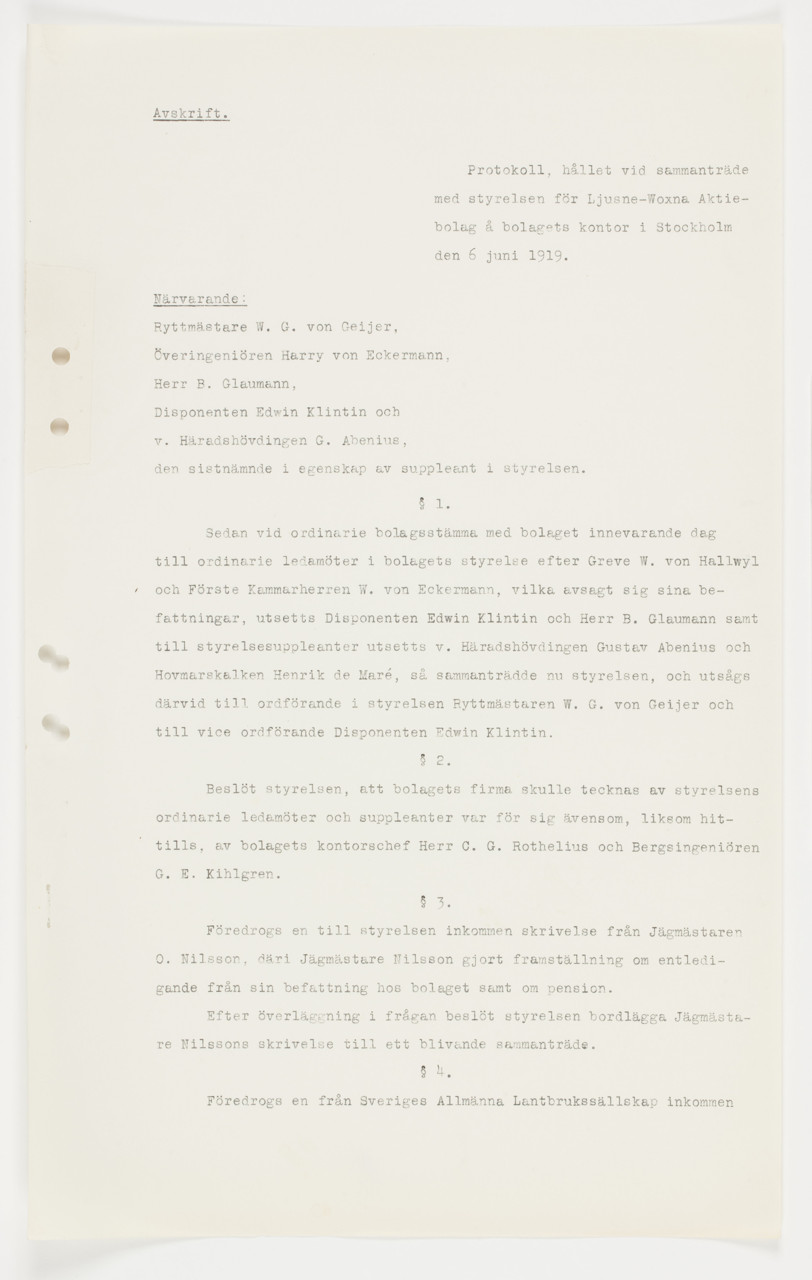 Avskrifter av styrelseprotokoll hållet hos styrelsen för Ljusne-woxna Aktiebolag 1919.,LXIV:II:B.g
