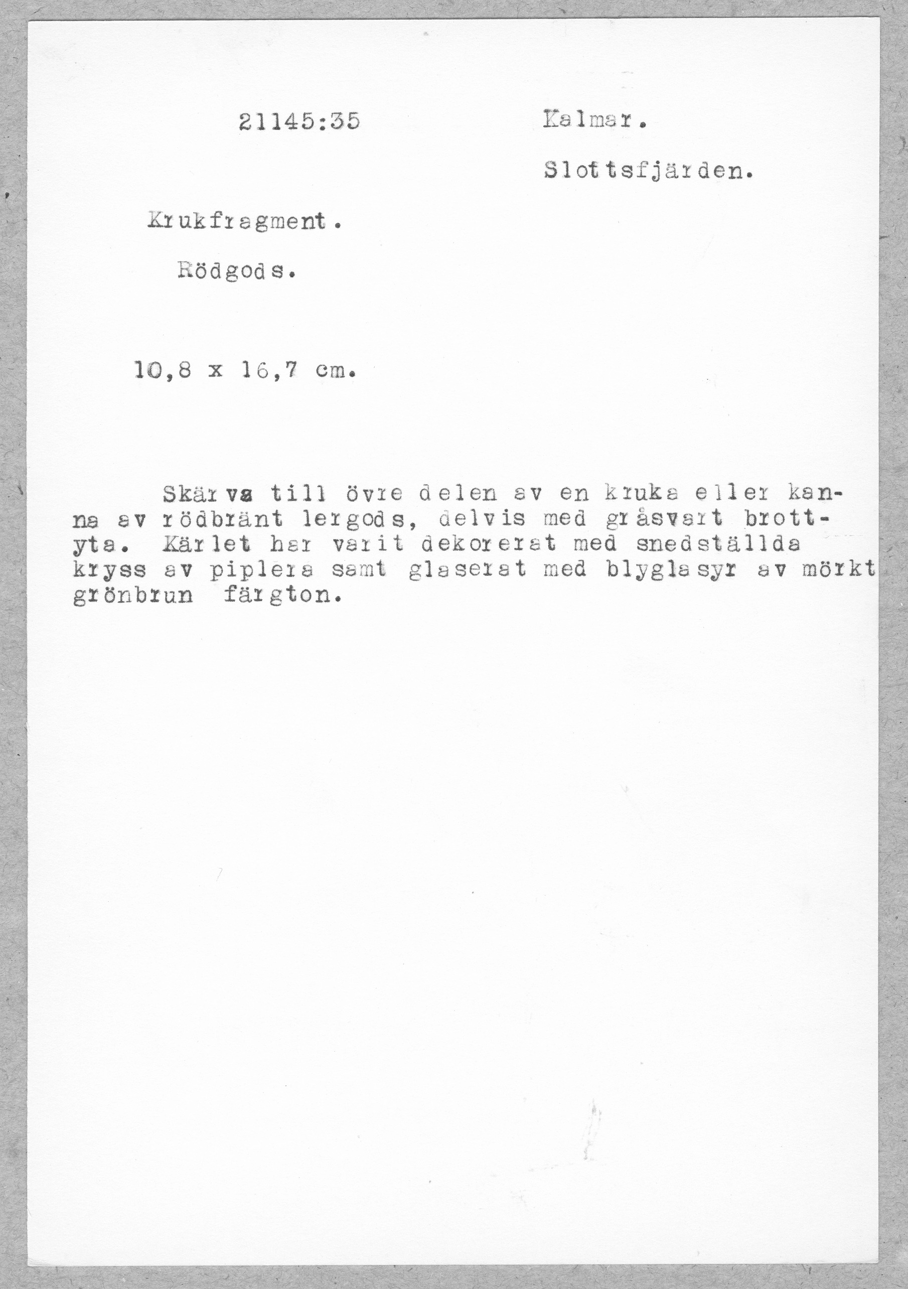 21145:35. Kalmar. Slottsfjärden. Krukfragment. Rödgods