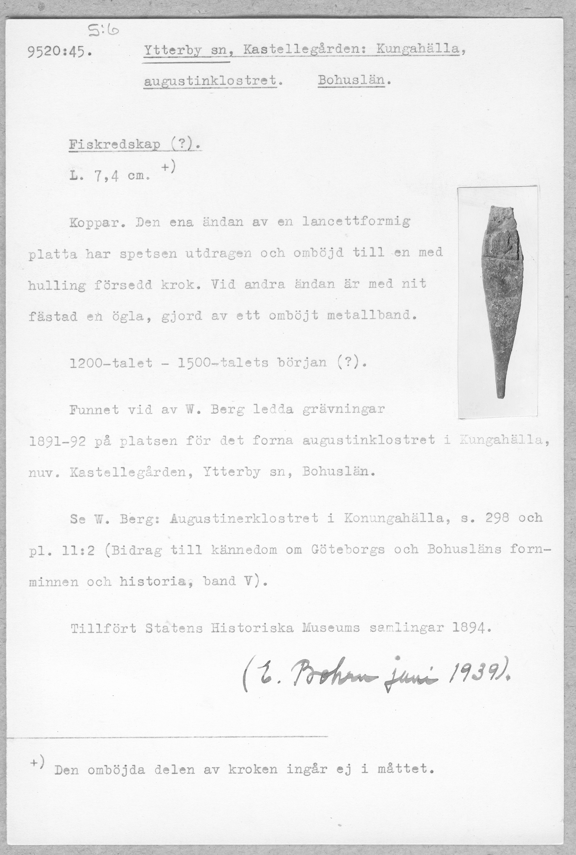 9520:45 \ Bohuslän \ Ytterby sn, Kastellegården: Kungahälla, augustinklostret. Bohuslän \ Fiskredskap (?) \ Medeltid
