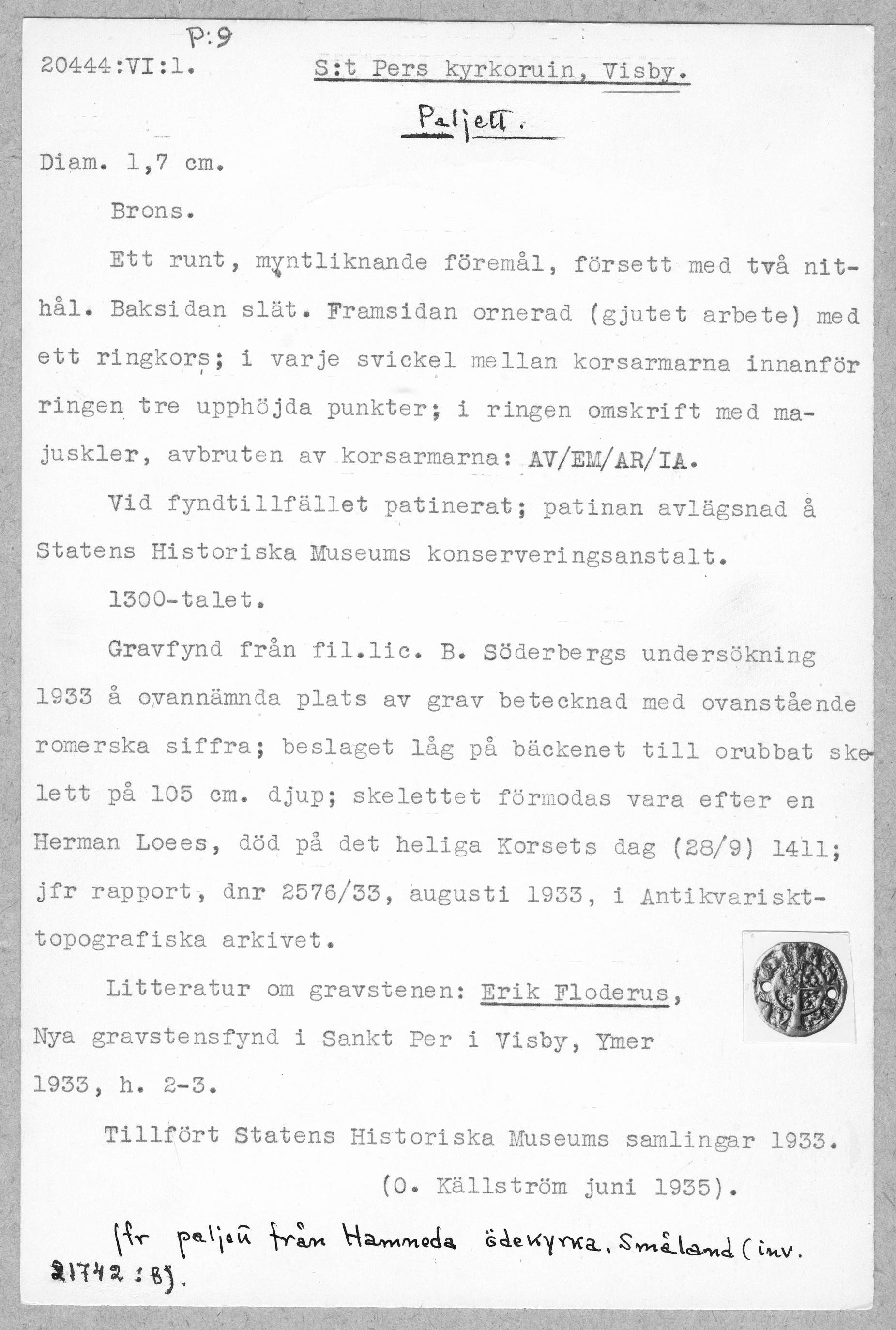 20444:VI:1 \ Gotland \ S:t Pers kyrkoruin, Visby. \ Paljett \ Medeltid