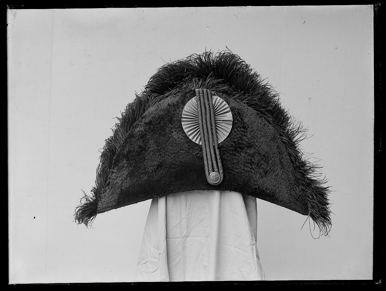 Hatt, bicorne, av svart silkesfelb med strutsfjädrar.