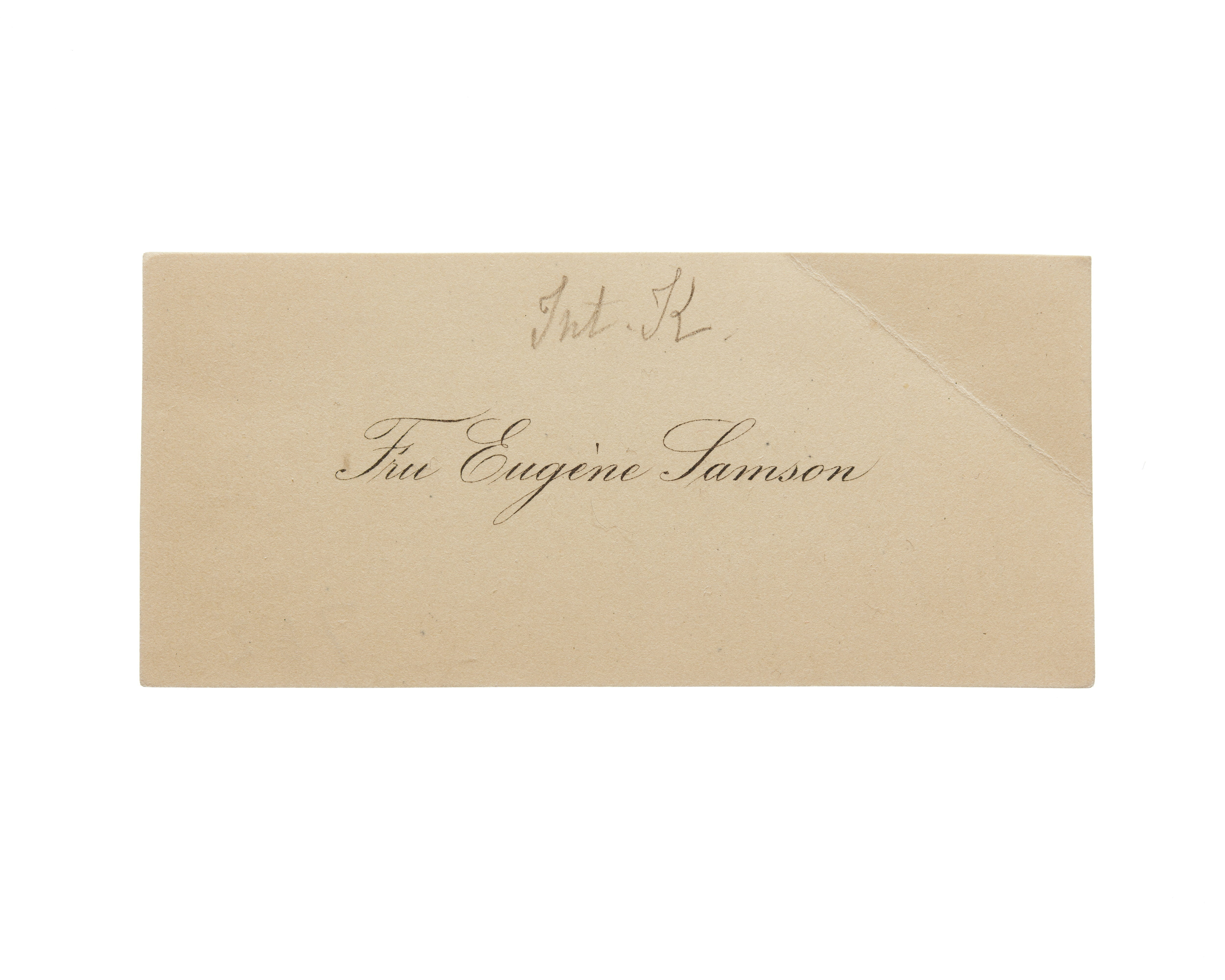 Visitkort från Fru Eugène Samson. Överlämnat i samband med Internationella kvinnoförbundets kongress i Stockholm 1911.