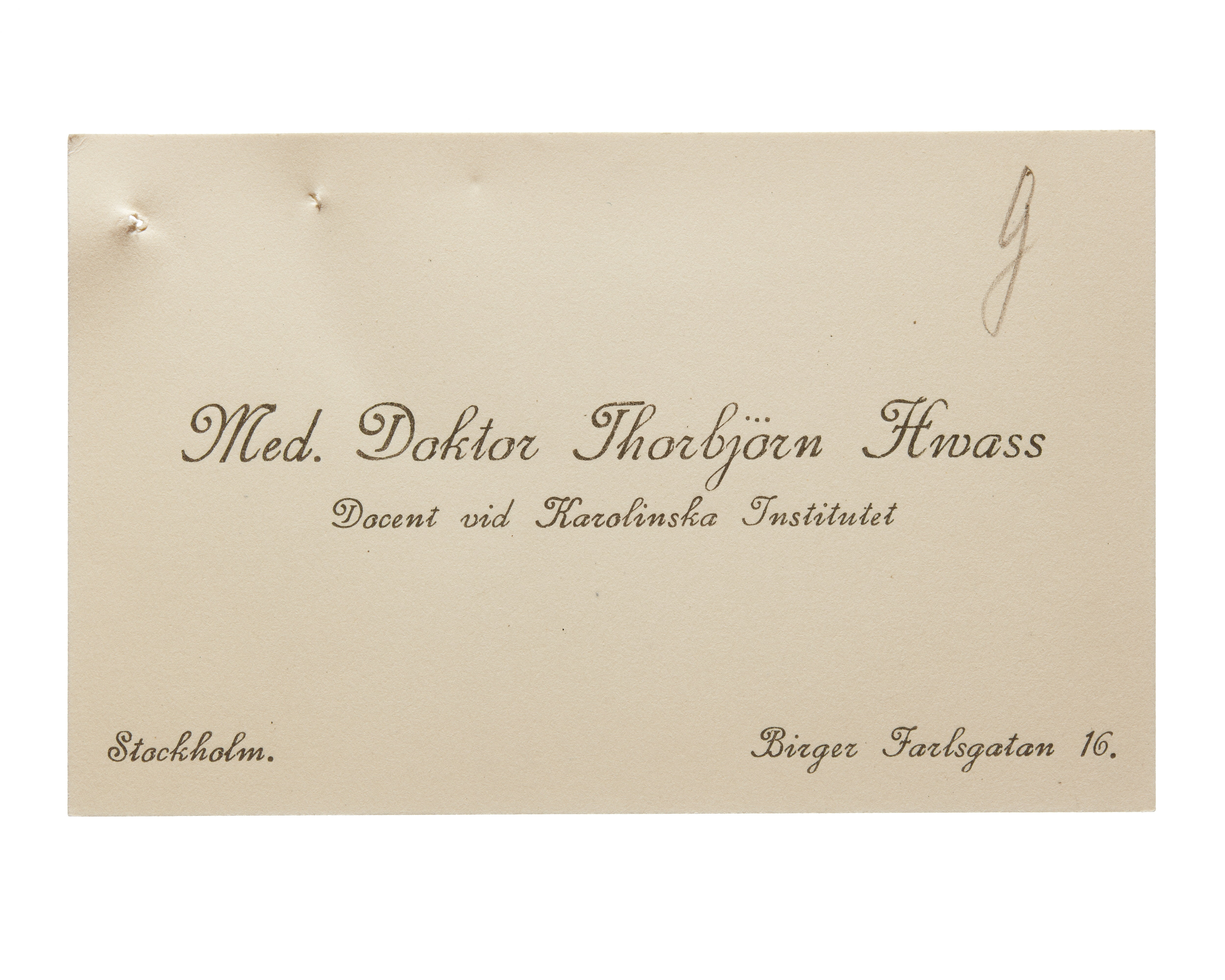 Visitkort från Thorbjörn Hwass, Birger Jarlsgatan 16 Stockholm, 1915.
