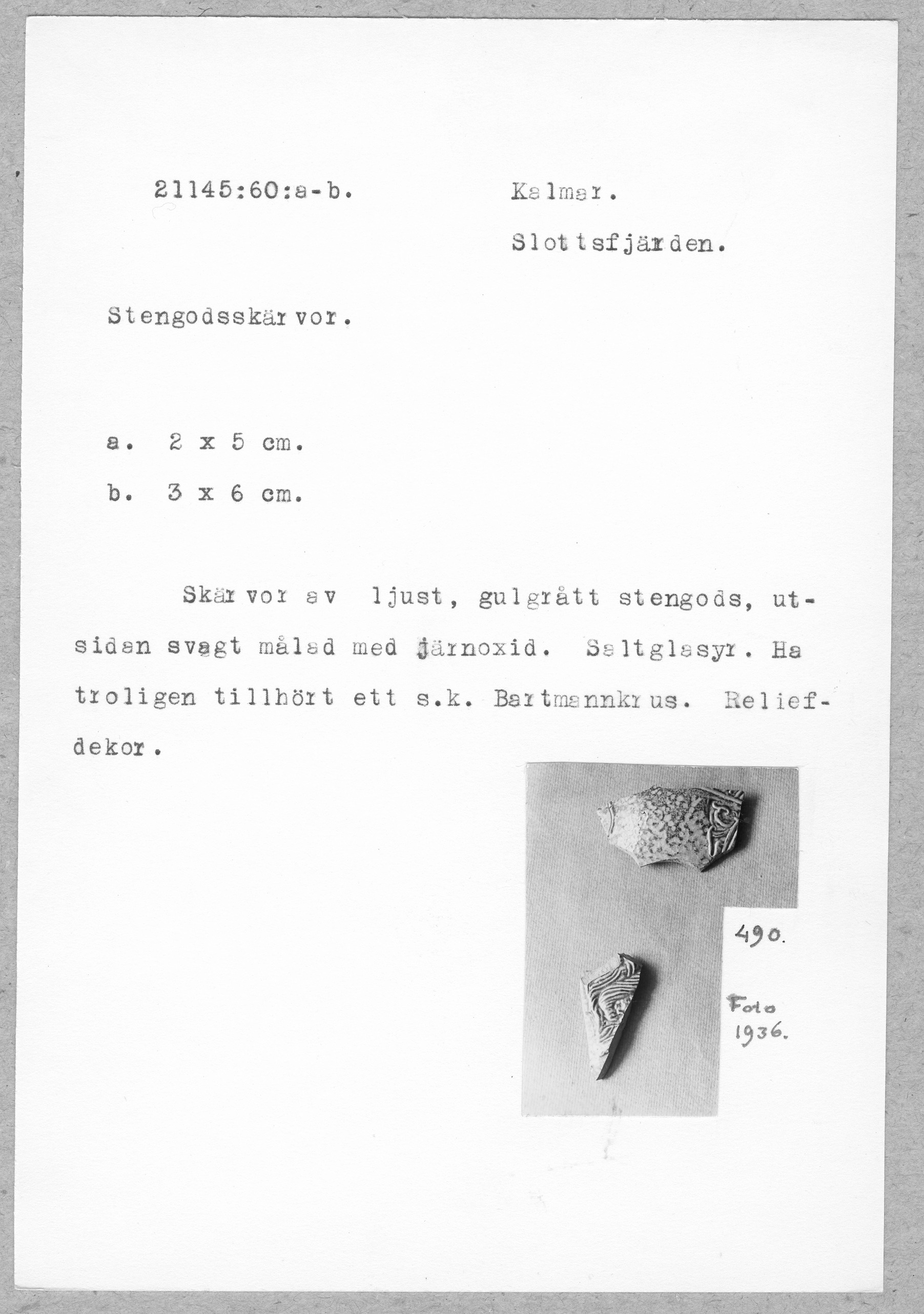 21145:60:a-b. Kalmar. Slottsfjärden. Stengodsskärvor